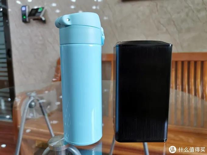 體積上來說,這款藍牙音箱并不是很大,大概小型保溫杯那么高,稍微有點“胖”,但一只手拎著很方便,也比較適合裝在背包里帶出門。