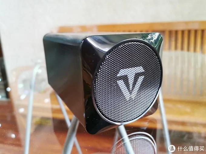 相對地另一端是藍牙音箱的喇叭,用一塊鋼制網罩保護著。網罩上印著天逸的logo。細膩密致的鋼制網罩,能夠有效柔化高頻毛刺感,讓聲音更加均衡動聽。
