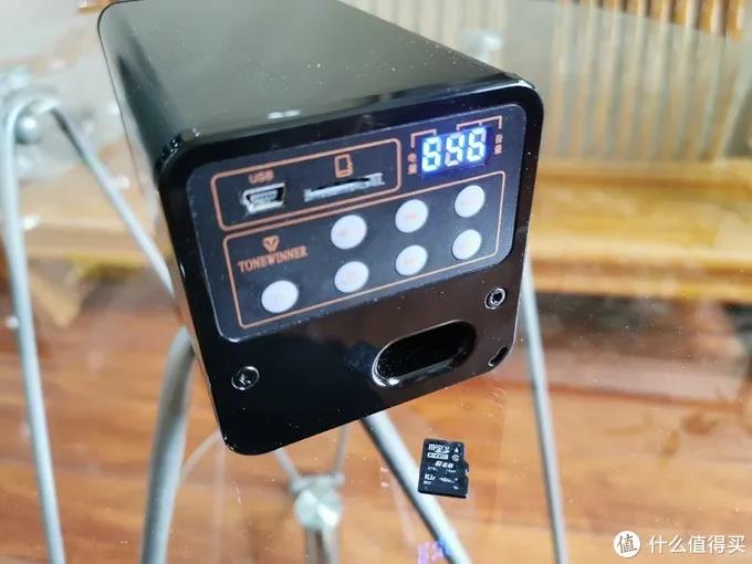 后端是功能面板。從上到下分別是電源/PC接口、TF卡插口,然后還有一個小小的顯示屏,底下是電源開關、菜單、歌曲上下鍵和音量鍵。按下電源按鈕開機,藍色顯示屏會顯示輸入方式、音量以及電量。