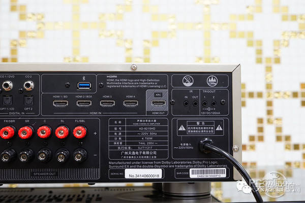 是功放的背面,接口非常豐富,足以滿足所有用戶的挑剔需求,提供了完整的7.1輸入(包括4組RCA輸入)、兩組光纖輸入、兩組同軸輸入、4路HDMI1.4輸入、FM天線以及3.0藍(lán)牙輸入、1路HDMI輸出,該機(jī)還增加了7.1聲道前級(jí)解碼模擬音頻信號(hào)輸出電路,搭配好音響后,用戶可以盡情享受最震撼的7.1聲道家庭影院效果。