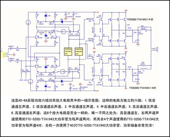 以下是AD-8PA一個聲道的功率放大電路圖,整機一共有6個獨立的單聲道功率放大電路: