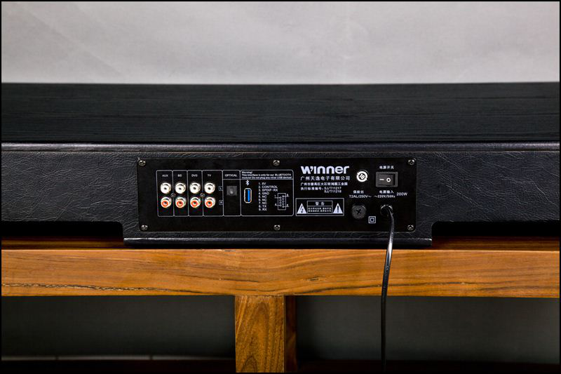 音箱采用了扁平狀長方體的箱體設(shè)計,因此正面看的時候它只是很薄的那么一塊。如果安裝了電視機底座,將電視機置于其上也并不會浪費電視柜的桌面面積。