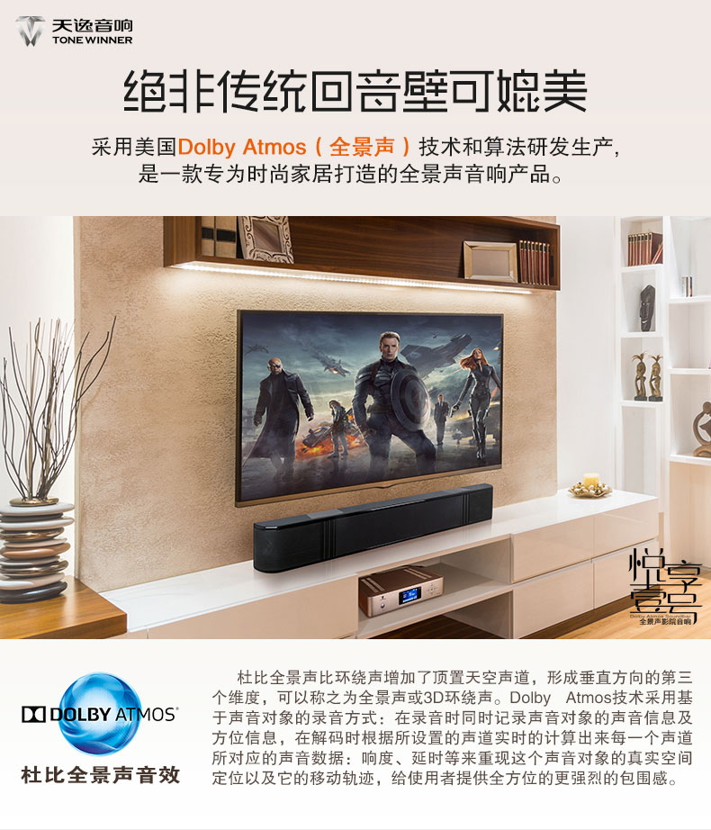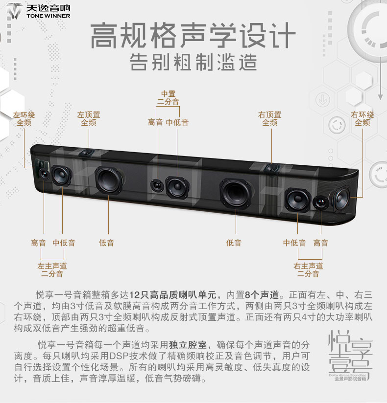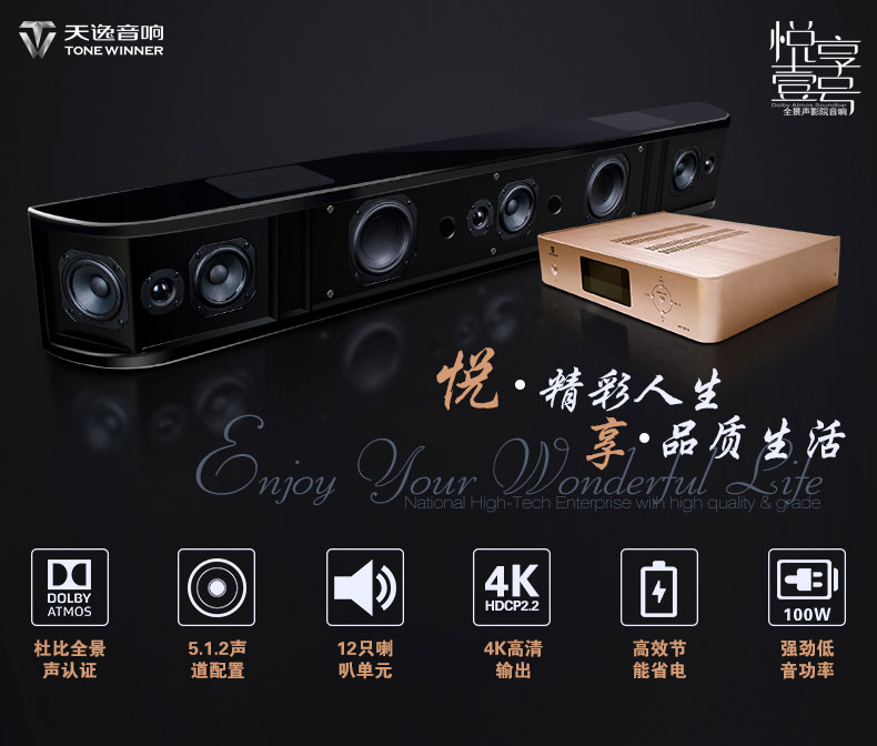 天逸悅享一號全景聲影院音響是廣州天逸電子有限公司研發(fā)的具備杜比全景聲功能的客廳影院音響系統(tǒng),它采用了當今最先進的Dolby Atmos技術(shù),并獲得了杜比實驗室的授權(quán)認證。