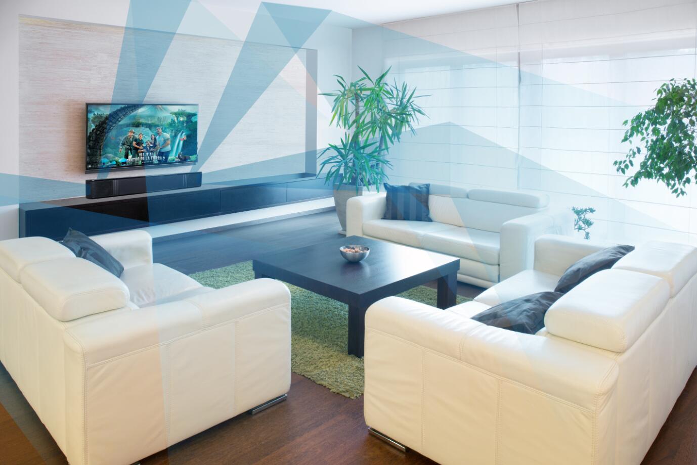 杜比全景聲Soundbar(電視音響)多會采用2.0.2到5.1.2的聲道配置。頂置聲道采用了安置在聲條(Soundbar)頂部的兩只斜向上的喇叭,通過天花板反射形成天空頂置聲道;由安置在聲條兩側(cè)的喇叭通過左右墻面反射產(chǎn)生左右環(huán)繞聲道。在一個狹小的聲條體積內(nèi)要安置8個獨立的聲道,并且要讓這些聲道產(chǎn)生3D的空間包圍感,杜比實驗室提供了獨特的后處理算法來增強空間包圍感。