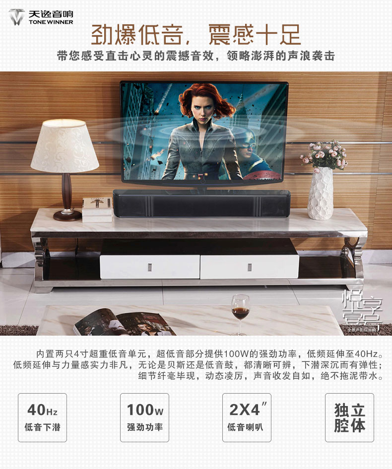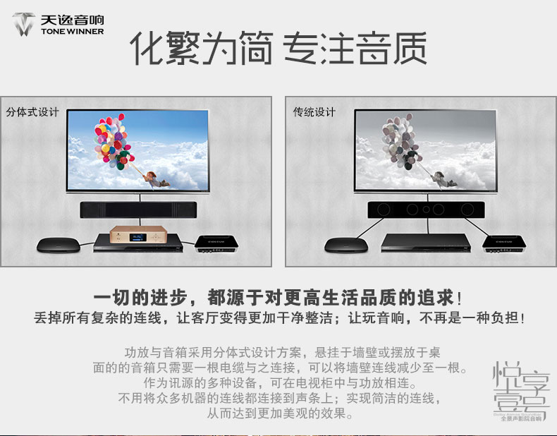 悅享一號全景聲影院音響采用了音頻解碼功放AT-01A搭配無源聲條AT-01S的分體式設(shè)計方案。這樣做的好處是懸掛于墻的聲條只需要一根電纜與之連接,將連線減至最少。作為訊源的多種設(shè)備:如藍光機、機頂盒、衛(wèi)星接收機等都在電視地柜上與AT-01A功放相連,不用將這些眾多機器的連線都連接到懸掛于墻上的聲條。