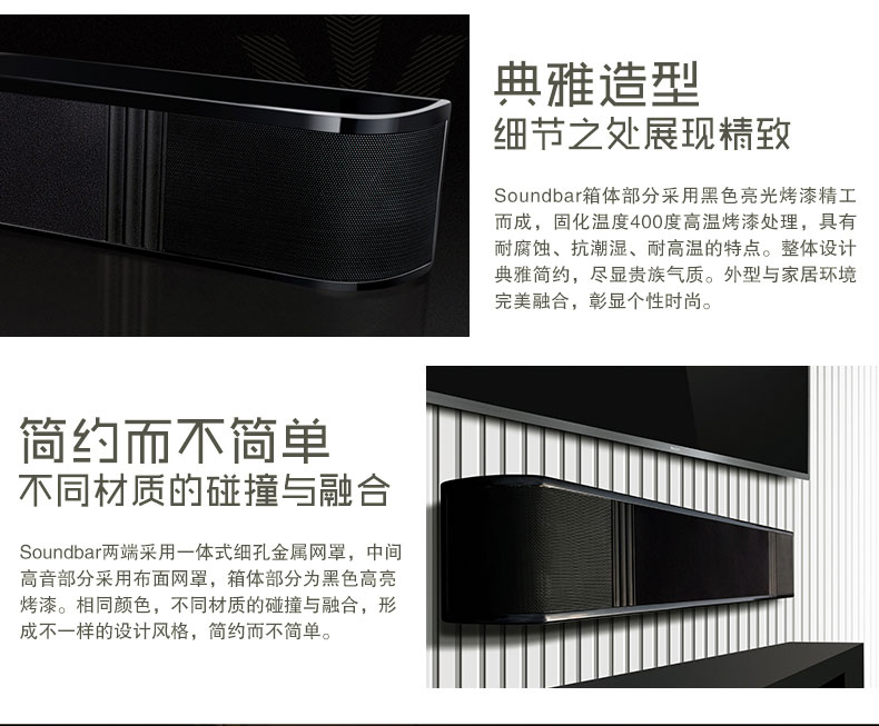 悅享一號全景聲影院音響系統(tǒng)的造型風(fēng)格給人的感覺是高端大氣、工藝精細,簡潔、時尚,同時又很好的兼顧了使用方便與聲音效果。