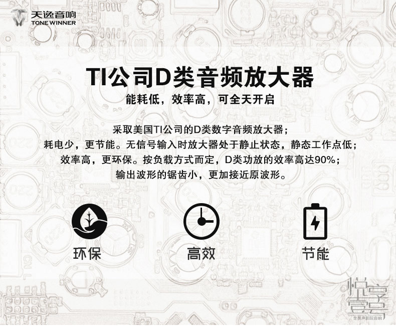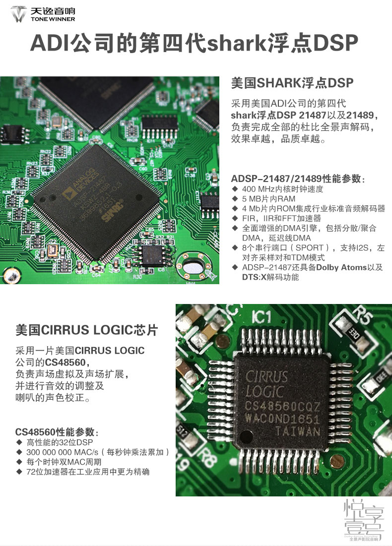 AT-01A采用三片DSP方案,其兩片為美國ADI公司的shark浮點DSP,21487以及21489,另外一片DSP為美國Cirrus Logic公司的CS48560,這三片DSP的處理能力十分強大,前兩片ADI芯片負責(zé)完成全部的杜比全景聲解碼,第3片CS48560 DSP負責(zé)進行聲場后處理,包括聲場虛擬及聲場擴展,并且還要進行音效的調(diào)整及喇叭的聲色校正。三片DSP完成杜比全景聲的解碼及音效后處理,效果卓越一流。功率放大部分采取美國TI公司最新最先進的數(shù)字放大器(D類放大器),提供25W×7 (RMS)的輸出功率。超低音部分提供100W的強勁功率。完美的解碼及聲場處理加上強大的驅(qū)動功率,能重現(xiàn)出卓越的全景式環(huán)繞音效,讓你在家也能有身臨其境的影院享受。