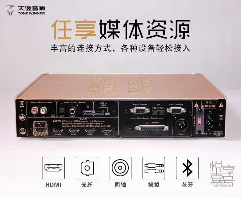 除有4組HDMI的輸入端口之外,AT-01A還提供了1組光纖和1組同軸數(shù)碼輸入,還有1組立體聲模擬音頻輸入。另外,還留有一個數(shù)字式藍牙接口,可以插入天逸配套專用的藍牙接收器(支持APTX),這樣就可以將手機或電腦上的音樂通過無線方式推送到悅享一號全景聲影院音響之上。