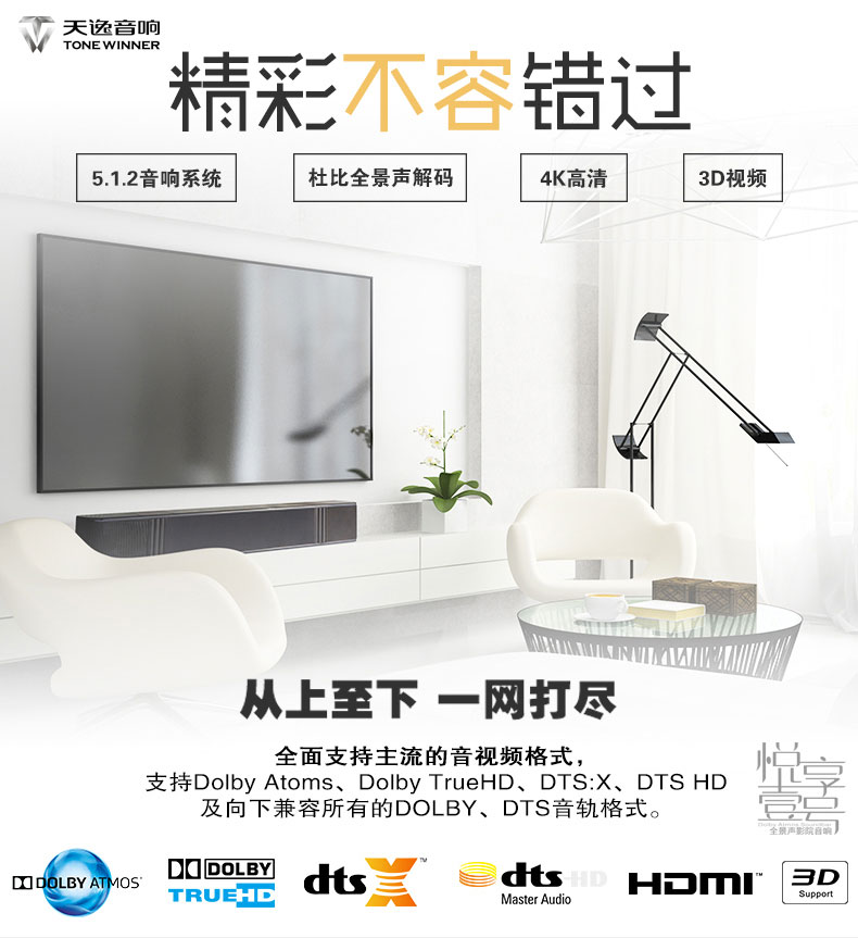 自從2012年在電影院推出以來,Dolby Atmos®徹底改變了電影院的聲音,并重振了家庭娛樂。2016年是全景聲元年,支持全景聲的家庭影院設(shè)備陸續(xù)面世,尤其是功放產(chǎn)品,全景聲片源也不再“一部難求”。然而,有一類音頻產(chǎn)品直到今年才開始提供支持,那就是——全景聲Soundbar。2017美國CES展上,多款全景聲Soundbar亮相,為客廳影院設(shè)計的全景聲Soundbar直接井噴!此款“現(xiàn)代客廳影院新貴”即將改變音響消費習(xí)慣!