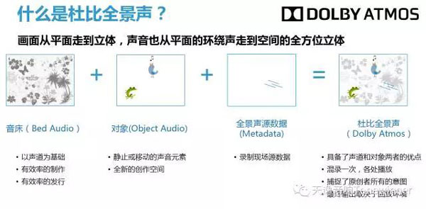有所了解的朋友應該知道,全景聲不僅僅是增加幾個聲道那么簡單,而是把整個聲音系統架構都顛覆了,從之前基于聲道來混音的技術上升為基于對象的音頻處理技術,也就是說聲音不再是按照聲道預設好的,而是根據具體環境,通過解碼器計算之后按照算法來指定具體的某些喇叭輸出。這是自環繞聲時代以來最重大的發展。杜比全景聲帶給聽眾更自然與真實的聲場,將生活元素鮮活地融入故事場景中。通過參考眾多電影專業人士的意見研發而成的杜比全景聲代表了音頻領域的一個重大轉折。它重塑了傳統環繞聲理論,為現在以及今后的環繞聲發展提供了一個完整的發展平臺。