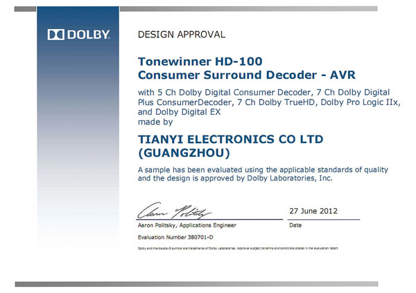 廣州天逸電子有限公司早在2014年獲得杜比全景聲授權,但由于國內市場片源不足等問題,產品遲遲未落到實處。經過長時間的調研和市場反饋,技術研發部設計出一款適合于中國客廳居住環境的小型全景聲影院套裝悅享一號。此乃國內第一款取得杜比認證的音響產品。悅享一號的推出,對我國音響行業的發展有著積極的促進作用。