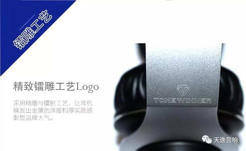 連接頭樑與耳罩的耳機支架采用貨真價實的鋁合金材質,采用工藝極其細膩的陽極氧化和精細噴砂工藝,并用鐳雕工藝將天逸Logo精雕其上,讓耳機看起來動感十足!銀白色的耳機支架與雅黑色的頭樑及耳機腔體有機的結合,形成了黑白分明的強烈對比,讓耳機煥發出金屬澤度和厚實質感!