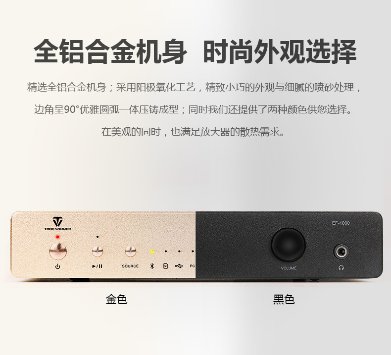 EF-1000作為天逸家族的新成員,一改HI-FI“前輩”的厚重外觀,以精巧、便攜的形象展現在大眾面前,并有最經典的香檳金和典雅黑兩種顏色可供選擇。精雕細琢的全鋁合金機身,不僅時尚美觀且有利于整機散熱;面板采用陽極氧化工藝與極其精細的噴砂處理,永不褪色;優雅圓弧棱角設計一體成型,美觀大氣且手感極佳。