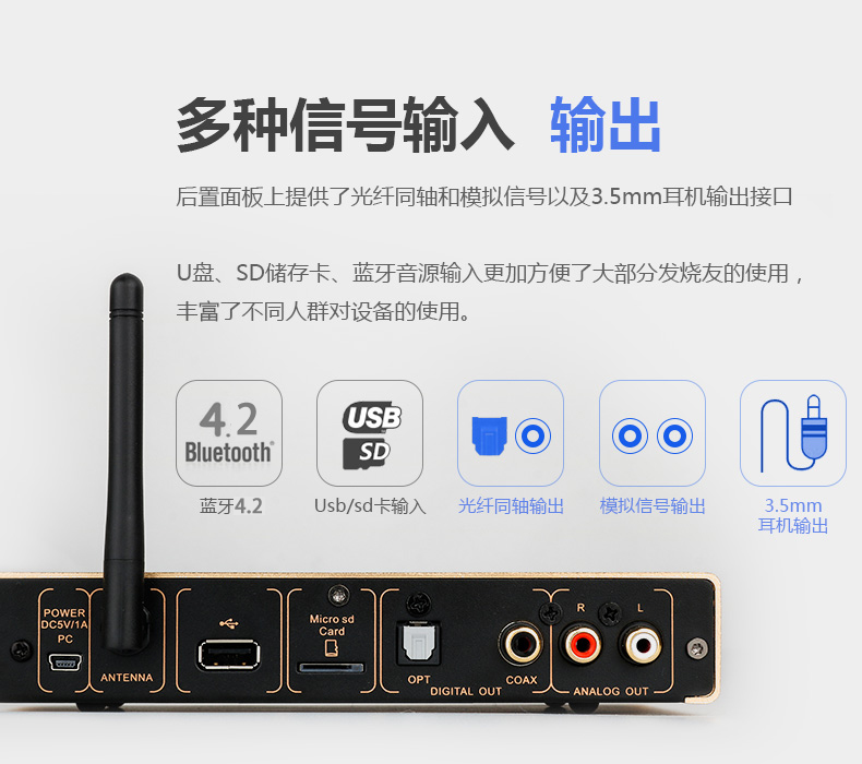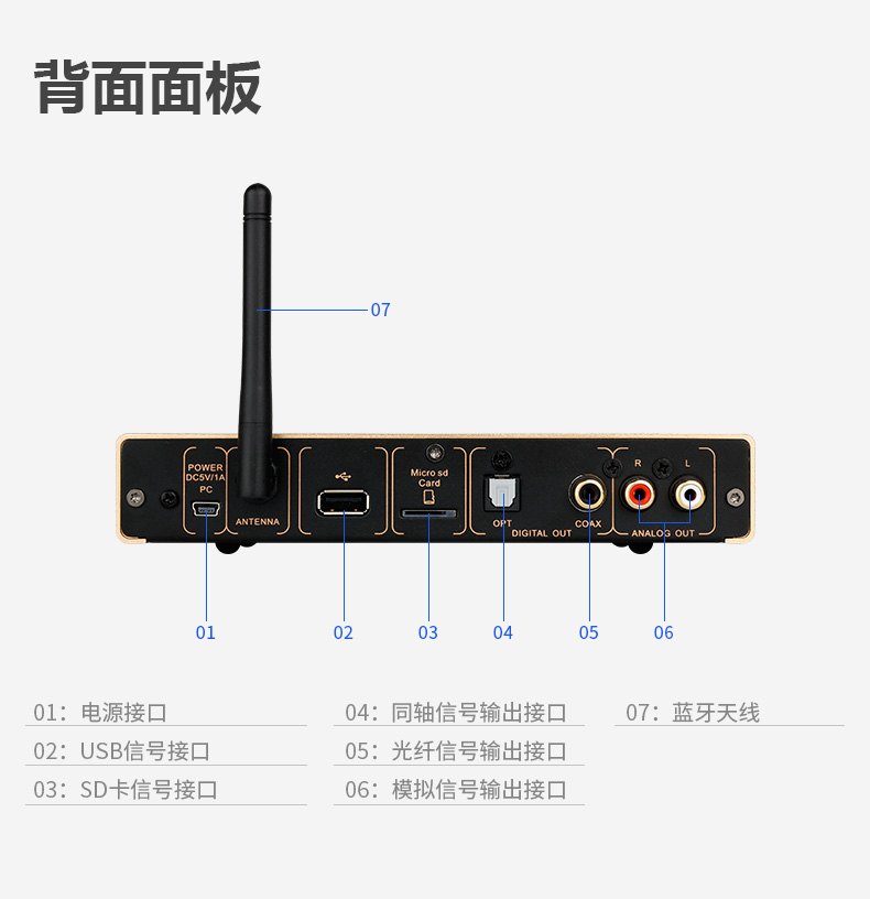 后背板的功能接口一覽無遺:多功能USB-Audio接口,藍牙接收天線, USB接口,TF卡接口,光纖、同軸輸出各一組以及一組模擬輸出接口。功能可謂一應俱全。