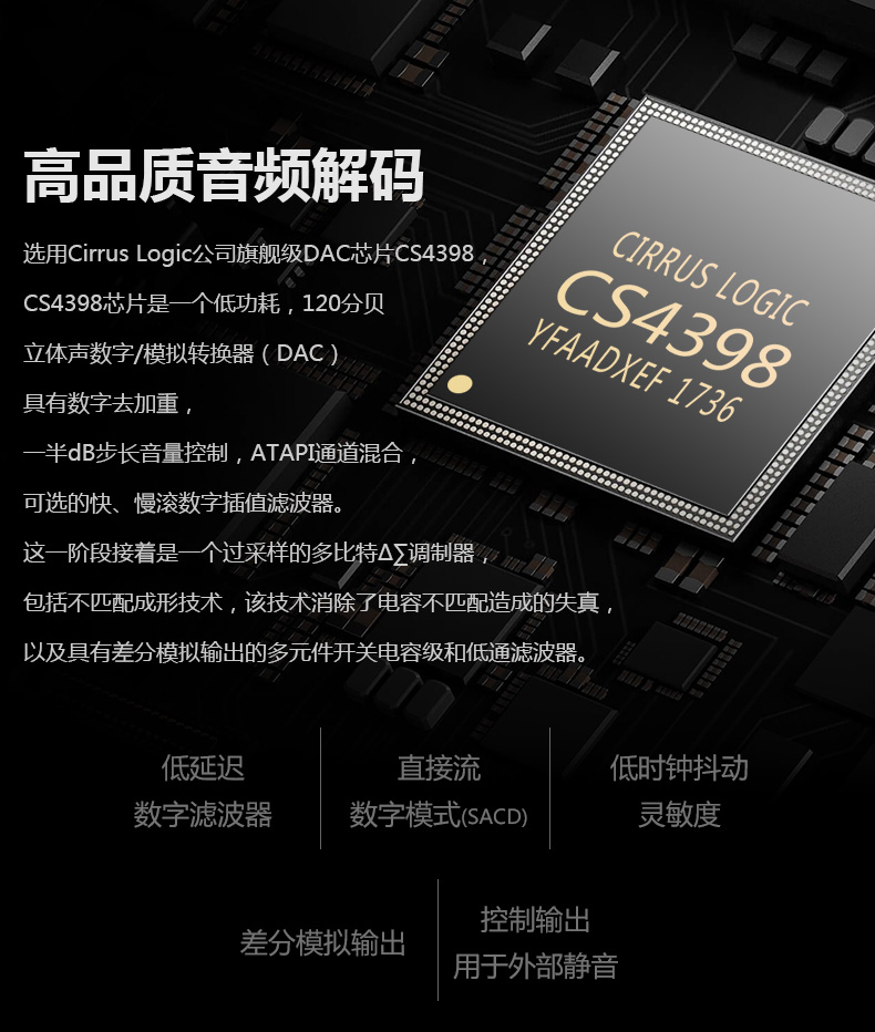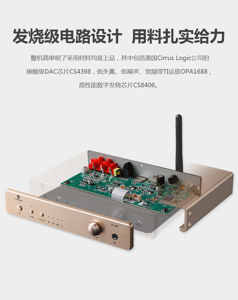 EF-1000采用發燒級電路設計,精選各種高品質器件,它的數字音頻解碼芯片選用Cirrus Logic旗艦級DAC芯片CS4398,該芯片是一個完善的立體聲24Bit/192K Hz數字至模擬(D/A)轉換系統,具有120dB以上的信噪比和動態范圍,總諧波失真+噪聲低至0.0005%,是一枚非常發燒的、常見于中高檔CD機上的D/A轉換器。