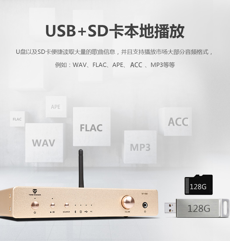 它是一款高品質的媒體播放器。EF-1000同時支持Micro CD卡(TF卡)及U盤播放本地音樂。它支持的信號格式十分廣泛,既支持WAV、FLAC、APE這一類的高品質的無損音樂信號,同時也支持MP3、AAC等高壓縮率的信號。該播放器采用了智能操作系統,信號采用源碼透傳方式直接輸出,將最原始數字音頻信號無損地傳輸到下一級放大電路,完全避開了有損音質的SRC(取樣率轉換)系統處理,最大程度地確保信號的低失真和純凈度。這種信號處理方式可使其聲音品質大為提升,極大程度的降低聲音中的毛刺感,使得聲音更順滑細膩,細節更為豐富,層次更加分明。
