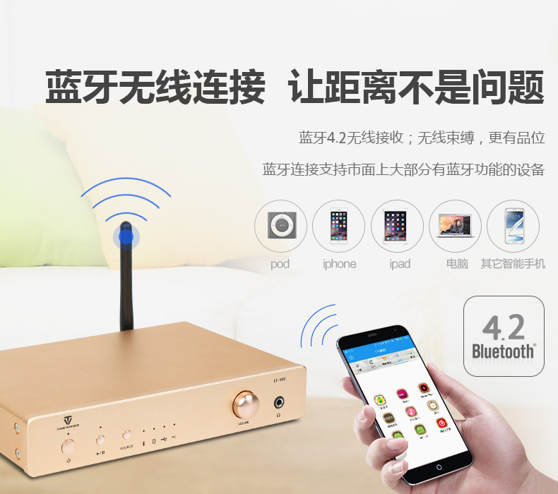 它支持無線藍牙傳輸。EF-1000采用了目前最先進的藍牙4.2配置,該藍牙芯片支持數字音頻輸出。相比普通藍牙版本,藍牙4.2版本在信號傳輸速度方面提速2.5倍,藍牙智能數據包的容量相比此前提高了10倍,同時降低傳輸錯誤率,且功耗更低。在與該播放器的藍牙配對時十分方便,且內置了自動重連功能,免除了用戶反復操作的煩惱。這些體驗上的升級對于用戶的日常使用來說是有明顯感受的。