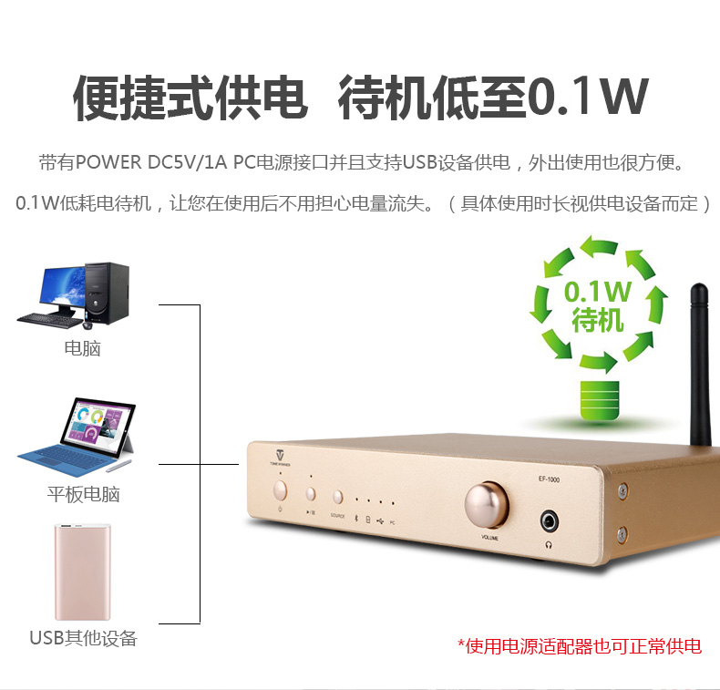 細心的朋友會發現,背板的USB-Audio接口絲印上標注的是“POWER DC5V/1A PC”,換言之,此多功能接口不僅可以連接電腦用于數字音頻傳輸,同時還能同時為EF-1000供電!事實上,除了用PC,用戶還能使用平板、手機、充電寶等移動設備進行供電!待機功耗低至0.1W,節能環保。如此強大的功能,在便攜性上得到了極好的保障。