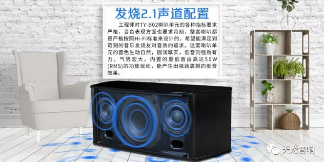 TY-B02采用了2.1的聲道配置,即左右聲道加超重低音。為了讓左右聲道的立體聲能在這樣一個狹小的箱體上產生出更大的立體聲聲場效果,工程師將 TY-B02的左右聲道設計了一個向外的夾角,這樣有利于聲場向外擴散,形成更好的立體聲效果和更加宏大的立體聲場表現。內置的超重低音由高達50W(RMS)的功放驅動,能產生出非常強勁震撼的低音效果。