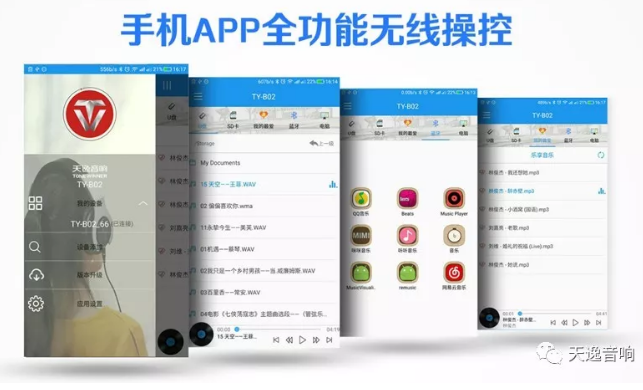 【APP配置】除此以外,強大的TY-B02還配備手機APP!這是天逸專為高保真數碼產品開發的專用APP,版面簡潔、功能實用、操作簡單,是一款人性化的設計。(PS:用戶只需關注微信公眾號:天逸音響,點擊底部菜單【服務支持-APP下載】即可獲取安裝。)APP和音箱之間通過藍牙進行連接,它可以讀取手機預設的音樂APP,從而播放手機本地歌曲;通過它用戶可以管理跟音箱連接播放設備,自由地切換音源,以及控制音箱的音量大小等操作。如此方便簡單的操作對于用戶來說無疑是一大福音。