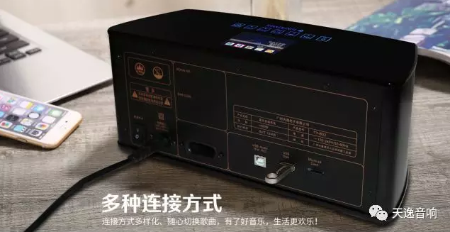TY-B02造型極其簡潔大方,通體采用黑色的配色方案,箱體材料使用鋁合金及亞克力制作,整體設計沒有一絲花哨的元素。頂、底部呈現鏡面效果,觸感順滑。頂部是一塊彩色TFT顯示屏,用于顯示操作信息及歌曲信息,并設置有帶背光的觸摸按鍵,給沉穩的設計增添一抹色彩。箱體加工制作十分精細,工藝考究,兩側采用鋁合金拉絲及陽極氧化工藝,正面弧形的金屬網罩下,3只喇叭單元隱約可見。TY-B02的外形雖不能讓人眼前一亮,但它既莊重典雅,又時尚大氣,現代感強!