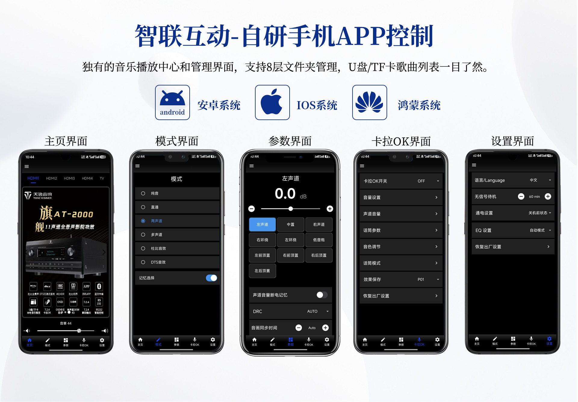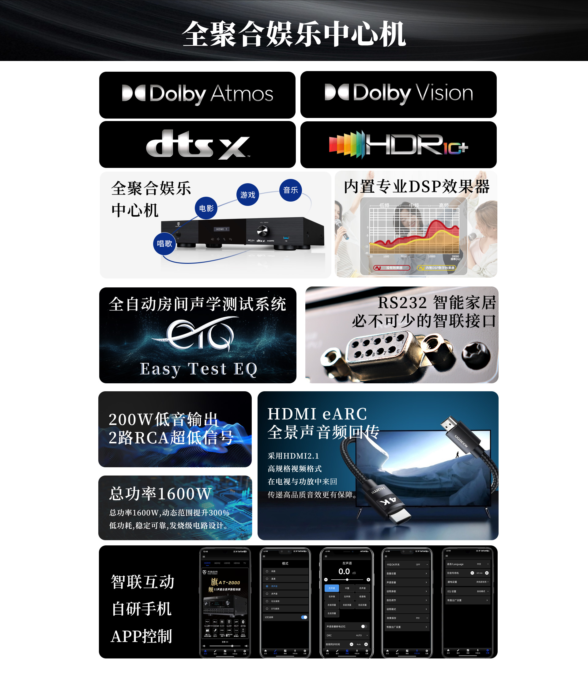 二、功能特性 1、支持DolbyAtmos、DolbyTrue-HD及向下兼容所有杜比音頻編碼文件; 2、支持DTS:X、DTS-Master及向下兼容所有DTS音頻編碼文件; 3、支持HDMI2.1,支持HDCP2.2加密協議; 4、支持3D立體電影,支持4K/60HZ,RGB4:4:4等格式; 5、支持Dolby Vision及HDR 10+超高清視頻信號; 6、多聲道沉浸式卡拉OK體驗,預設多種演唱風格; 7、支持HDMI eARC音頻回傳;支持CEC控制; 8、支持HDMI4進1出,光纖、同軸接口一應俱全; 9、內置全球五大測試系統之--ETQ房間聲學自動測試校正軟件; 10、支持藍牙/U盤/TF卡無損音樂播放,支持手機APP操作; 11、內置8聲道大功率輸出,總輸出功率高達1600W; 12、支持RS232智能控制; 13、支持OSD全中文菜單操作顯示,畫中畫可視調整更直觀; 14、支持按輸入源獨立設置及保存參數的功能; 15、支持音視頻混搭編組; 16、開關機狀態記憶功能; 17、支持整機參數備份及調用; 18、支持用戶參數保存及調用設置; 19、7~11段參數EQ滿足個性聲音喜好調節; 20、內置多種觀影模式及K歌模式,輕松調用; 21、預設多種揚聲器布局方式,一鍵調用,輕松設置; 22、面板簡潔時尚,觸摸式樣功能鍵。