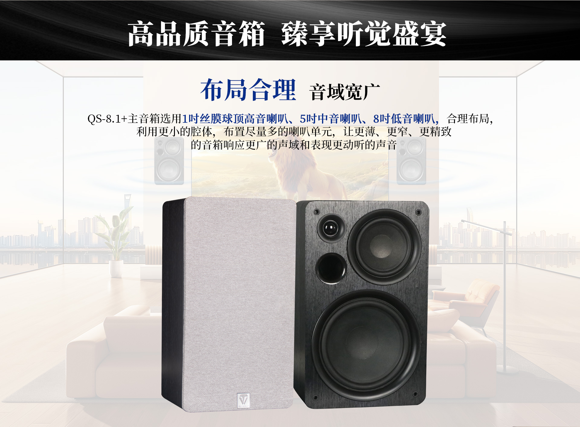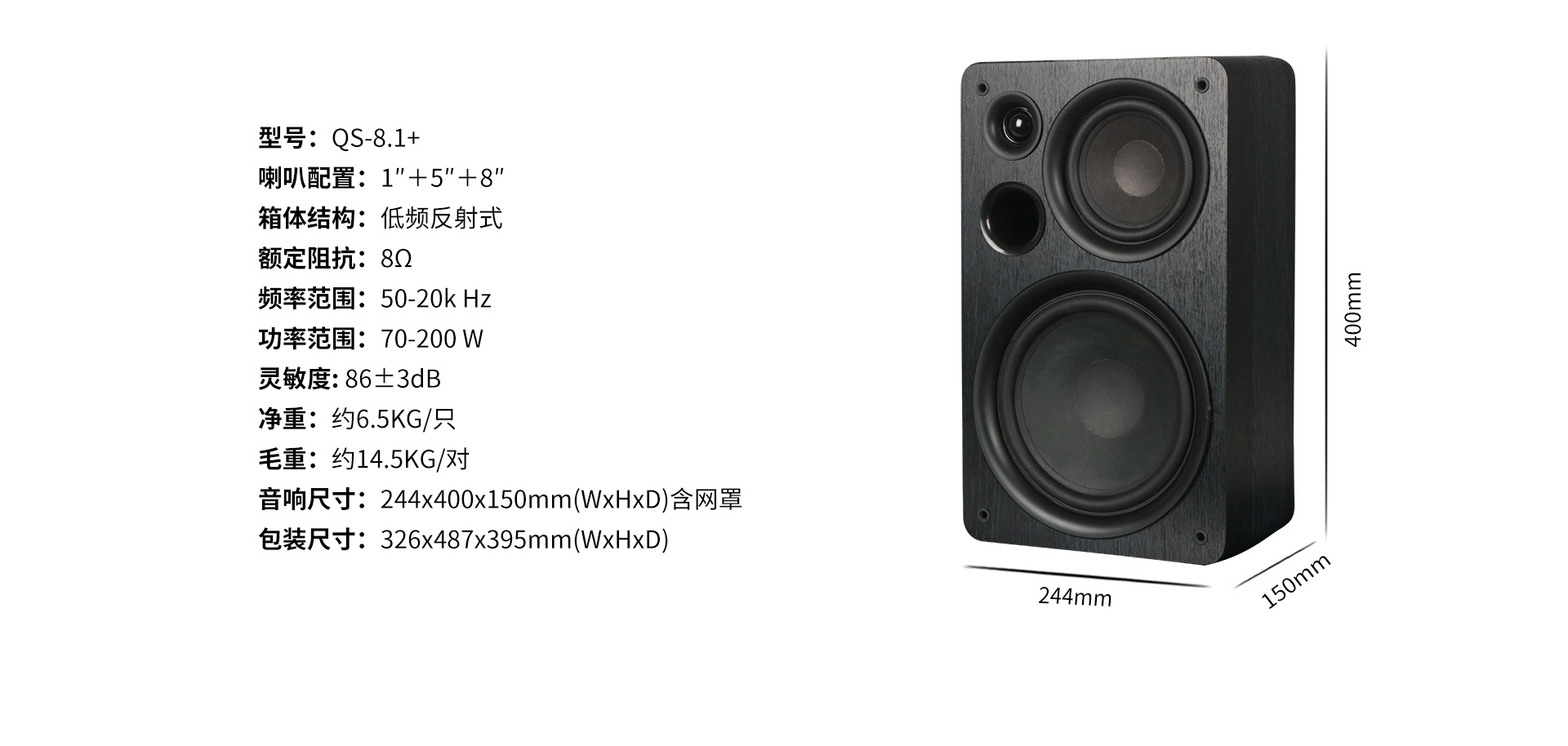 型號:QS-8.1+ 喇叭配置:1"+5"+8" 箱體結構:低頻反射式 額定阻抗:8Ω 頻率范圍:50-20k Hz 功率范圍:70-200W 靈敏度:86±3dB 凈重:約6.5kg/只 毛重:約14.5kg/對 音響尺寸:244x400x150mm(WxHxD)含網罩 包裝尺寸:326x487x395mm(WxHxD)