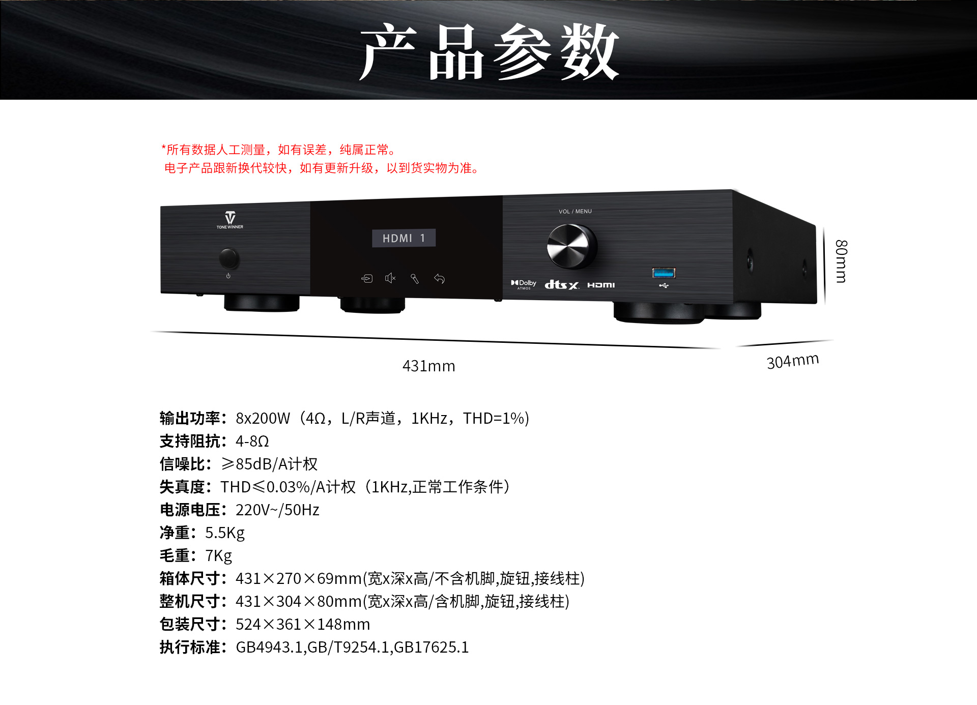 四、性能參數 主機功放 輸出功率:8x200W(4Ω,L/R聲道,1KHz,THD=1%) 支持阻抗:4-8Ω 信噪比:≥85dB/A計權 失真度:THD≤0.03%/A計權(1KHz,正常工作條件) 電源電壓:220V~/50Hz 凈重:5.5Kg 毛重:7Kg 箱體尺寸:431x270x69mm(寬x深x高/不含機腳,旋鈕,接線柱) 整機尺寸:431x304x80mm(寬x深x高/含機腳,旋鈕,接線柱) 包裝尺寸:524x361x148mm 執行標準:GB4943.1,GB/T9254.1,GB17625.1