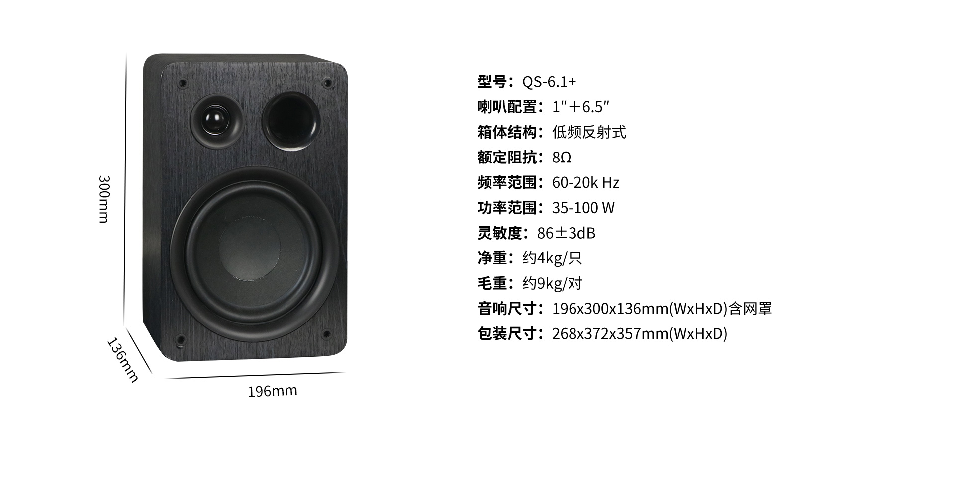 型號:QS-6.1+ 喇叭配置:1"+6.5'' 箱體結構:低頻反射式 額定阻抗:8Ω 頻率范圍:60-20k HZ 功率范圍:35-100W 靈敏度:86±3dB 凈重:約4kg/只 毛重:約9kg/對 音響尺寸:196x300x136mm(WxHxD)含網罩 包裝尺寸:268x372x357mm(WxHxD)