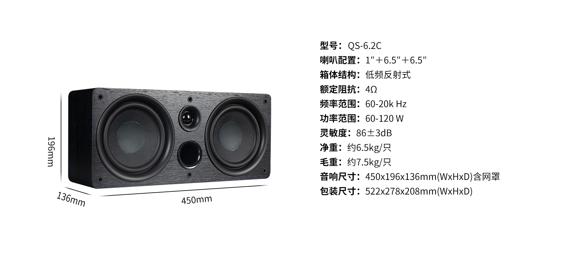 型號:QS-6.2C 喇叭配置:1"+6.5"+6.5" 箱體結構:低頻反射式 額定阻抗:4Ω 頻率范圍:60-20k Hz 功率范圍:60-120W 靈敏度:86±3dB 凈重:約6.5kg/只 毛重:約7.5kg/只 音響尺寸:450x196x136mm(WxHxD)含網罩 包裝尺寸:522x278x208mm(WxHxD) |