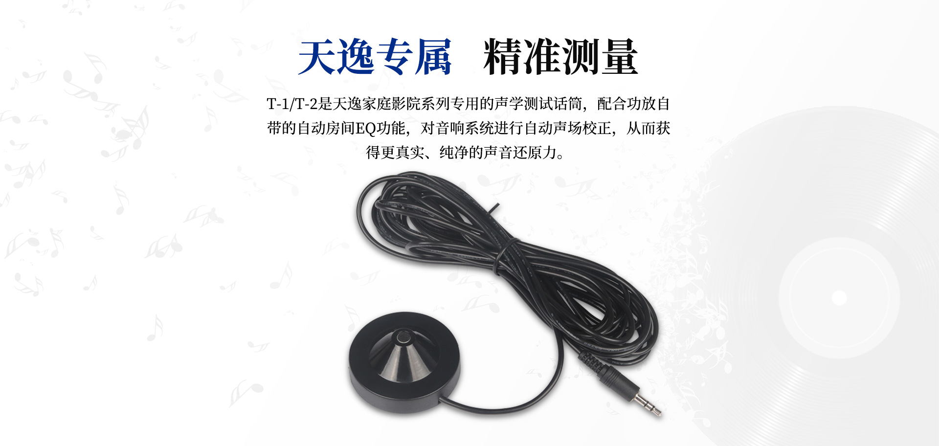 T-1/T-2是天逸家庭影院系列的專業級聲學測試話筒。搭配功放自帶的自動房間EQ功能,在自動識別音響系統狀況后進行自動聲場校正,獲得更精準的音頻定位。