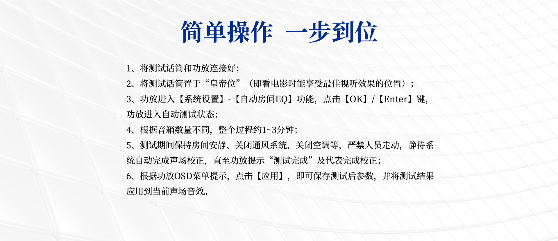使用方法:將測試話筒與功放連接好之后,將話筒置于“皇帝位”;通過功放菜單進入“自動測試狀態”,期間要保持房間安靜;靜待系統自動完成聲場校正(全程約1-3分鐘),直至提示“測試完成”即為完成校正;根據功放OSD菜單提示點擊“應用”,保存參數后即可應用至當前聲場音效中。