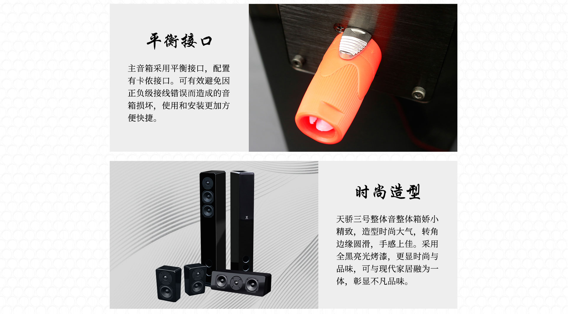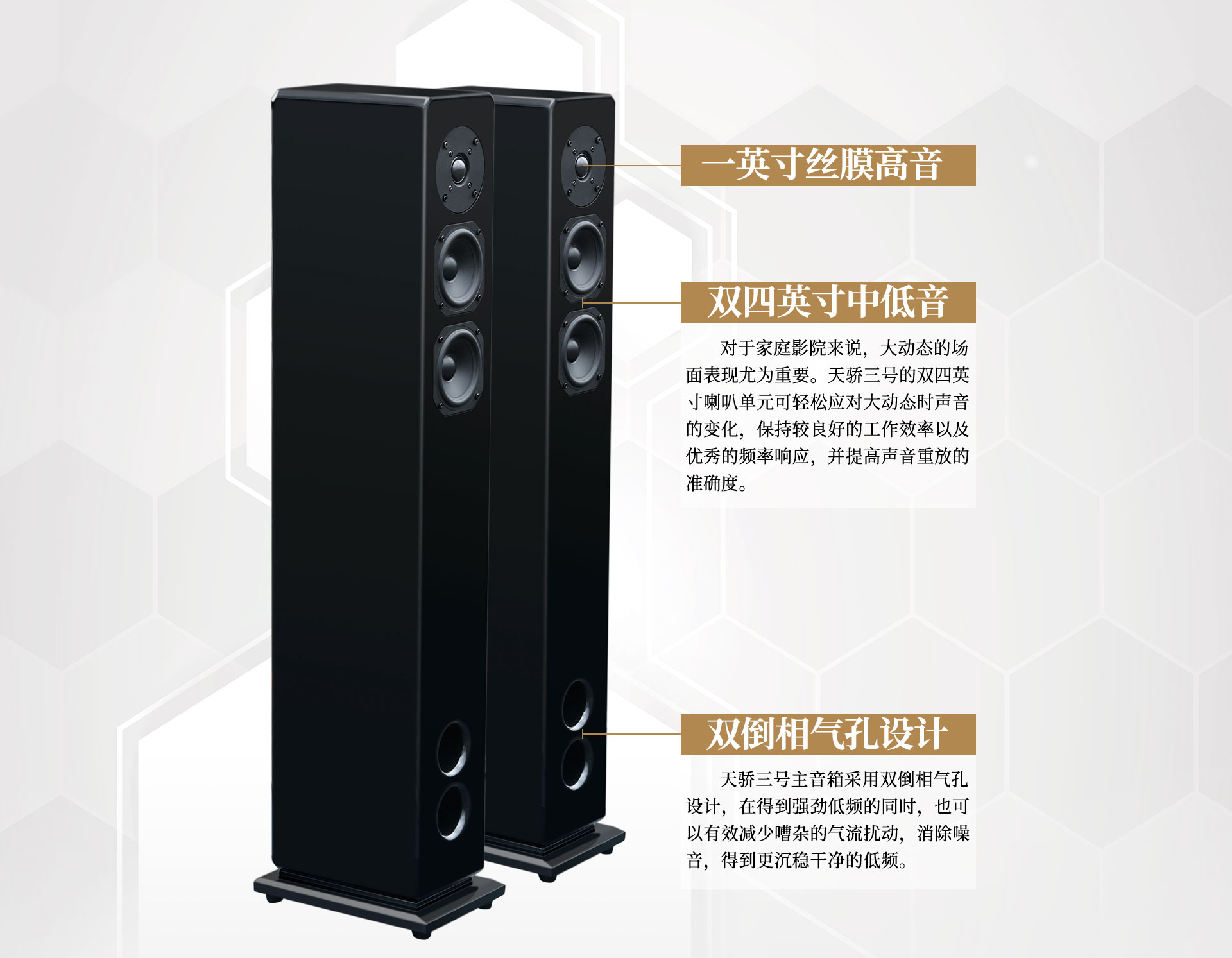 一、功能特點 1. 天驕三號采用輕盈柔韌的一英寸球頂絲膜高音單元,可有效拓展高頻的音域,且具有優(yōu)秀的頻率響應、廣泛的聲學擴散和較低的音色渲染。音質清晰細膩,溫暖明艷。 2. 采用四英寸中低音喇叭單元,精選天然原木紙盆材料音色表現(xiàn)好,靈敏度高低音穩(wěn),中音靚,聲音特性十分平順自然。 3. 進口金屬化聚丙烯膜電容和高純度銅箔電感組成的分頻器,讓每個不同的喇叭單體將優(yōu)秀的發(fā)聲頻段充分的表現(xiàn)出來。 4. 主音箱采用平衡接口,配置有卡儂接口。 5. 專為現(xiàn)代客廳而設計,支持5.1/7.1聲道輸出。 二、性能參數(shù) 型號:天驕三號主音箱 喇叭單元:1"x1+4"x2 頻率響應:45Hz-20KHz 功率:100W 額定阻抗:4Ω 靈敏度:85dB(1W·1M) 凈機尺寸:174x998x260mm 凈重:23.5Kg/對