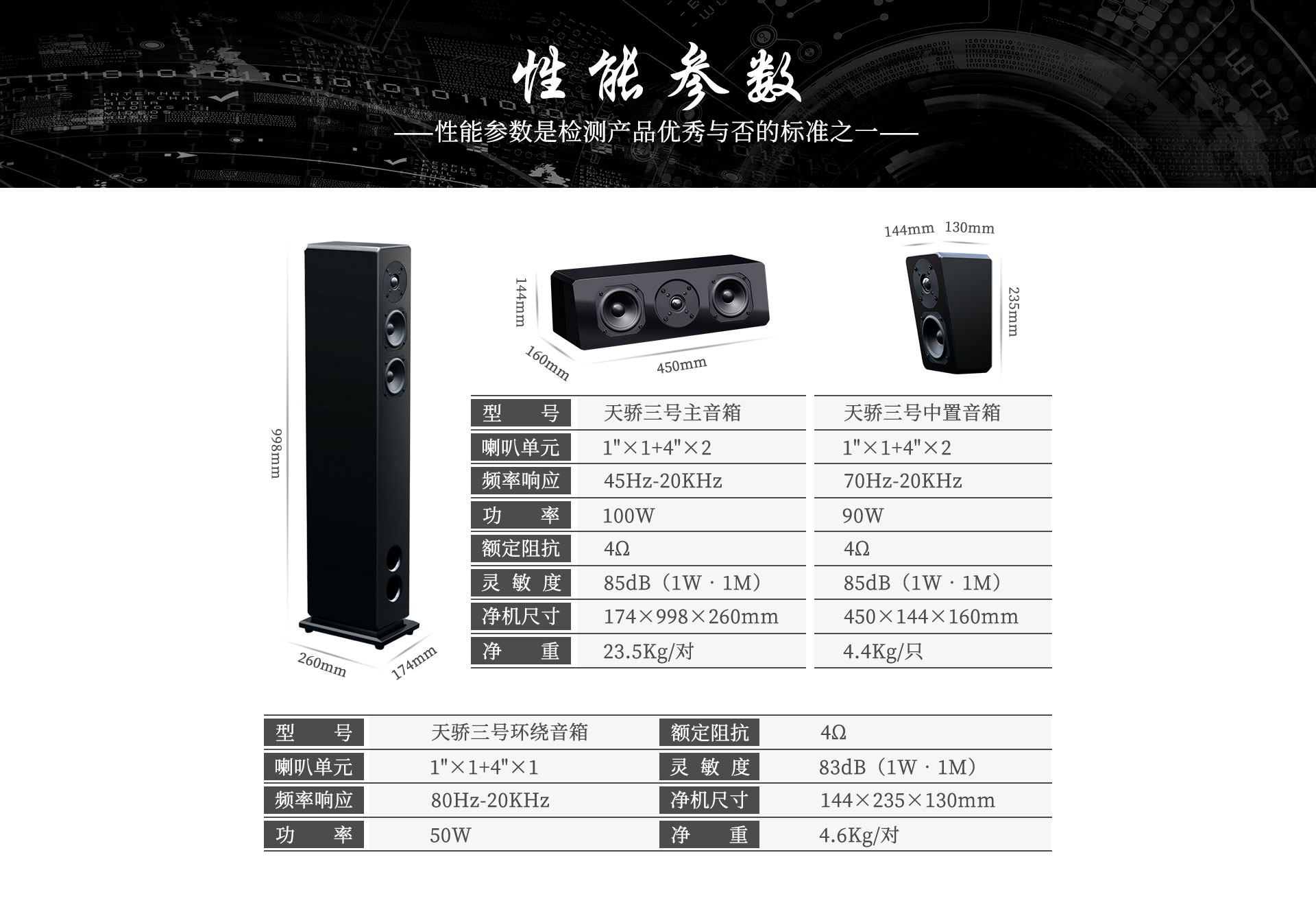 型號:天驕三號中置音箱 喇叭單元:1"x1+4"x2 頻率響應:70Hz-20KHz 功率:90W 額定阻抗:4Ω 靈敏度:85dB(1W·1M) 凈機尺寸:450x144x160mm 凈重:4.4Kg/只