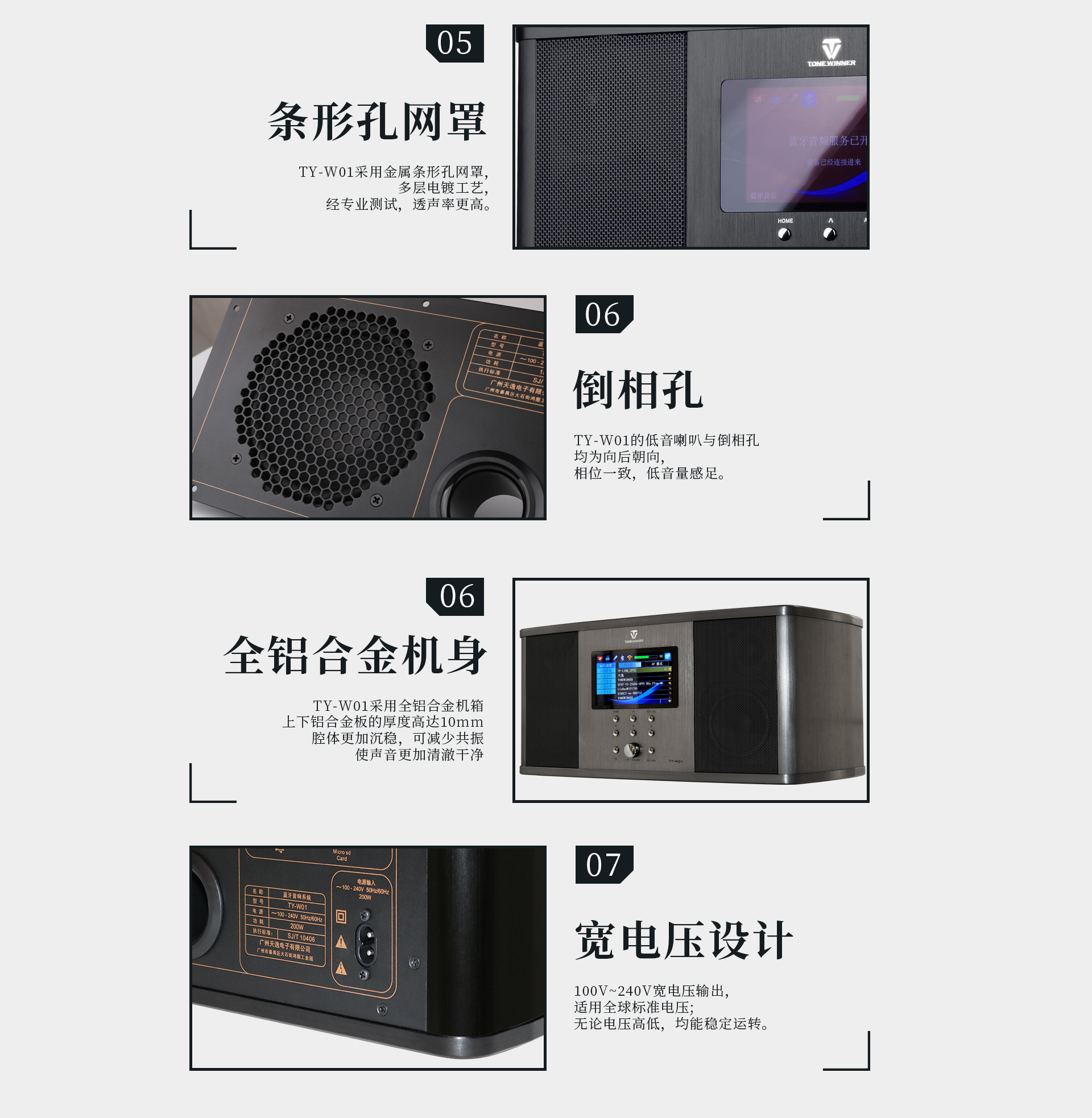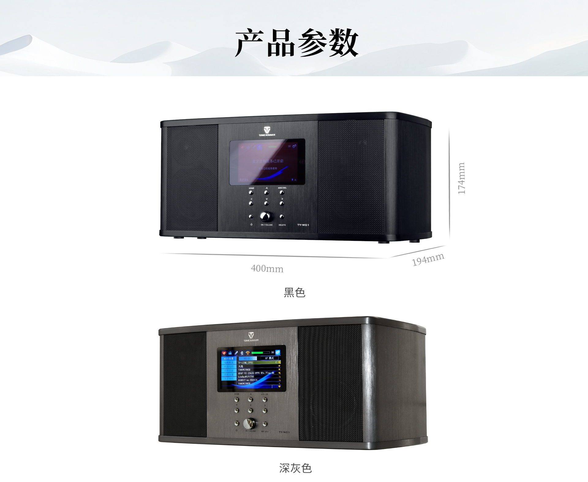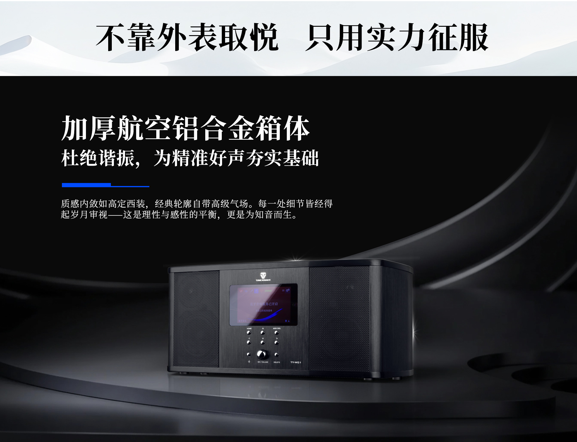 TY-W01通體采用全鋁合金打造,上下鋁合金的厚度高達10MM,沉穩(wěn)扎實,有效避免腔體共振,發(fā)聲更加純凈、通透。表面經(jīng)工業(yè)拉絲陽極氧化處理,形成的細(xì)膩觸感與溫潤光澤,更顯內(nèi)斂與高級,且不易留痕,保持潔凈質(zhì)感。搭載的4寸真彩屏,直觀清晰,色彩鮮艷。整體造型經(jīng)典、高質(zhì)。