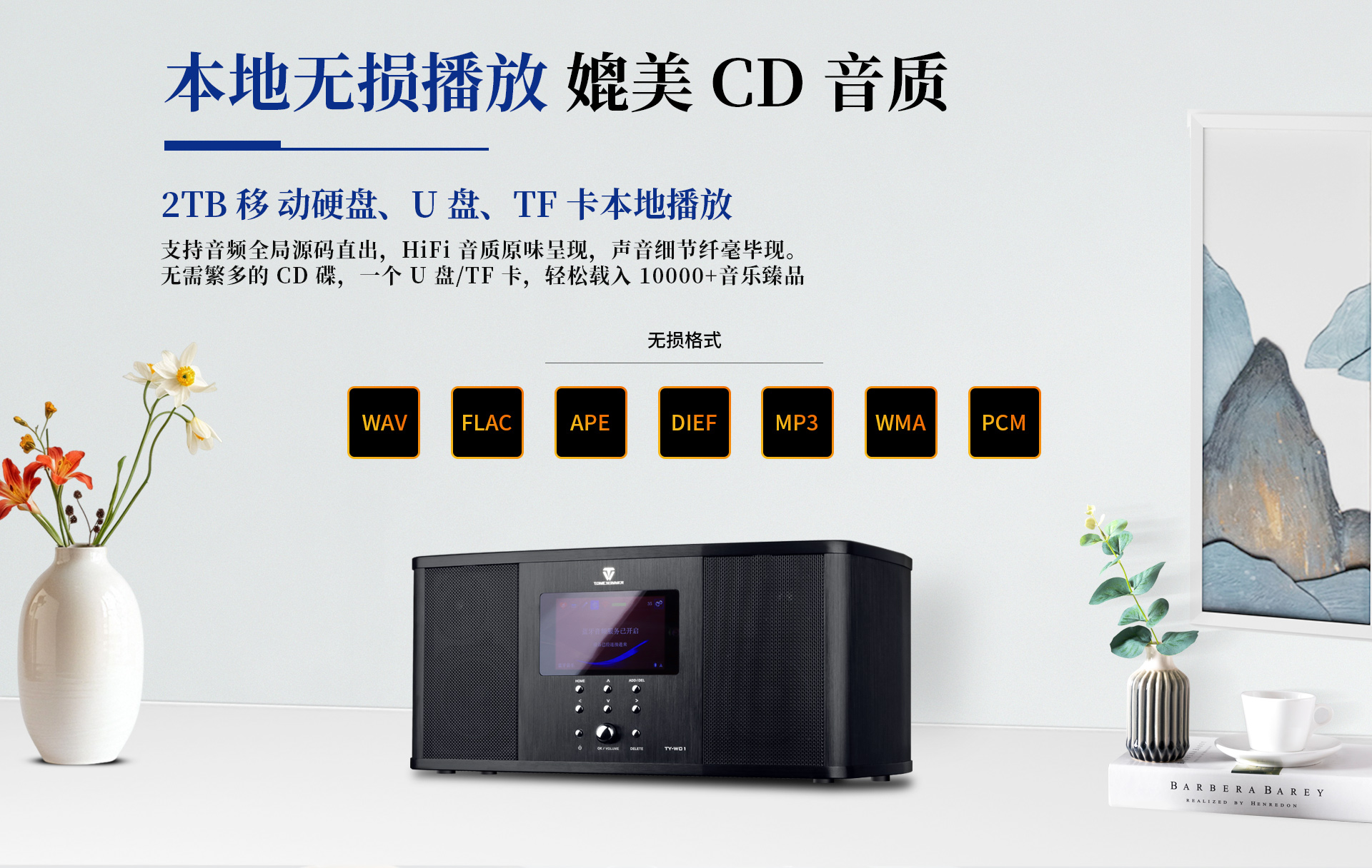 1、支持2TB移動硬盤、U盤、TF卡本地播放,支持格式WAVFLACAPE等無損音樂信號。