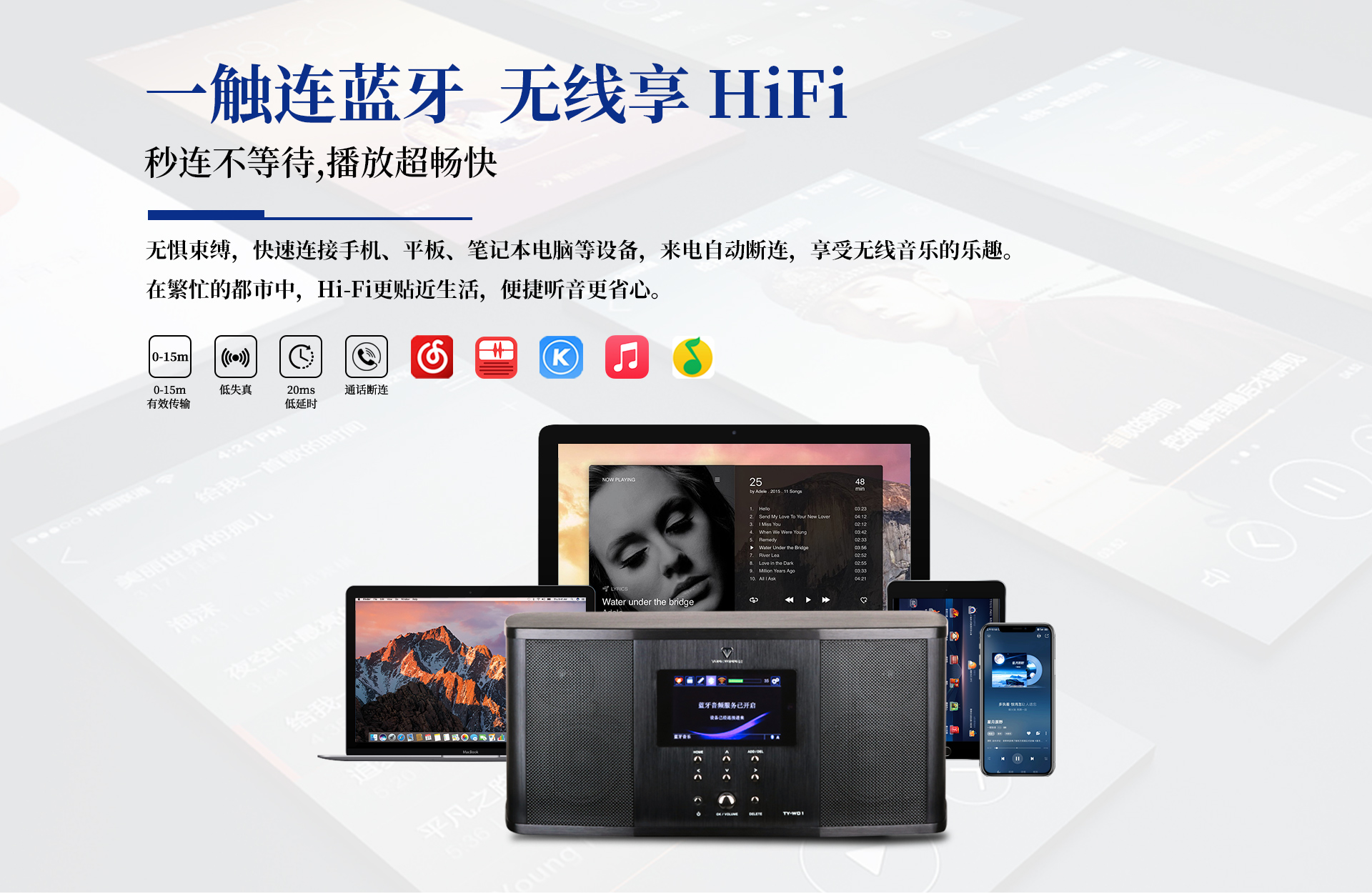 2、支持藍(lán)牙無線連接,傳輸高速、低損耗、穩(wěn)定,暢享海量音樂曲庫。