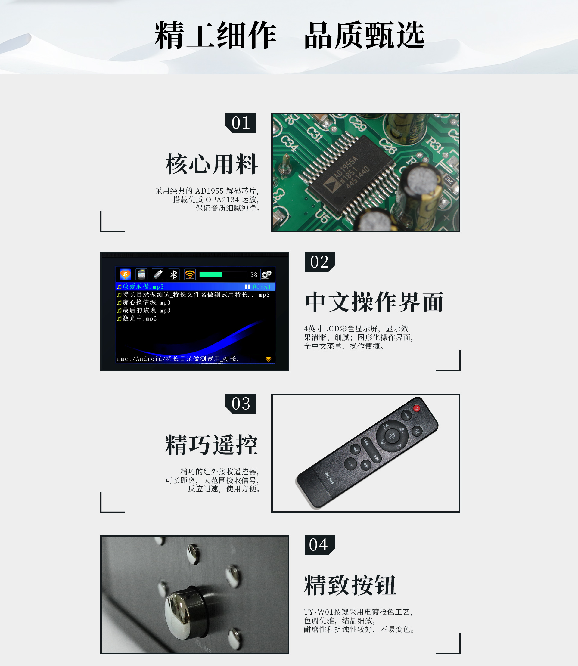 1、采用經(jīng)典的AD1955解碼芯片,搭載優(yōu)質(zhì)OPA2134運放,保障音質(zhì)純凈細(xì)膩;功放芯片采用TAS5711芯片,集信號處理與功率于一體,兼具高運算速率與穩(wěn)定品質(zhì)。