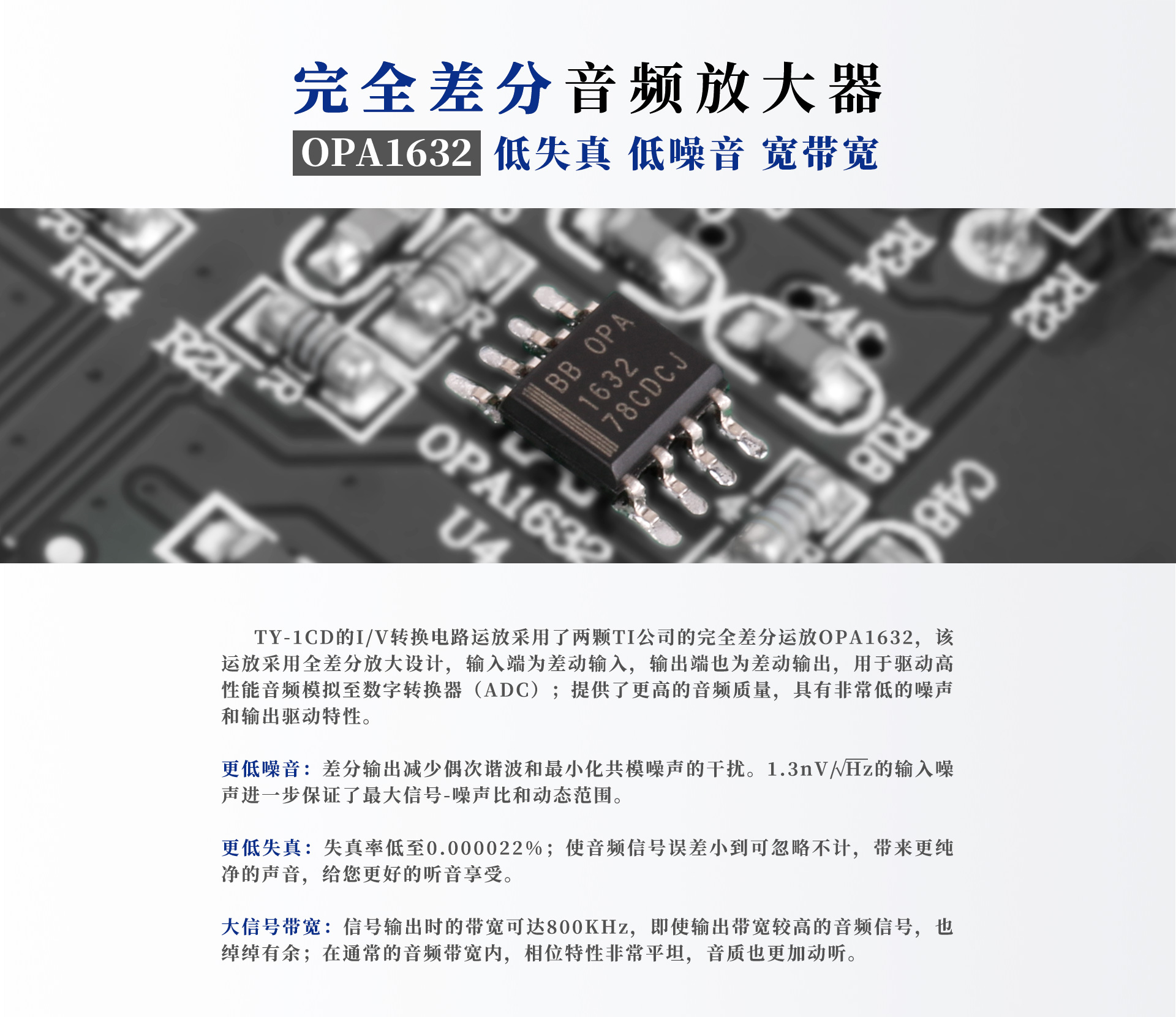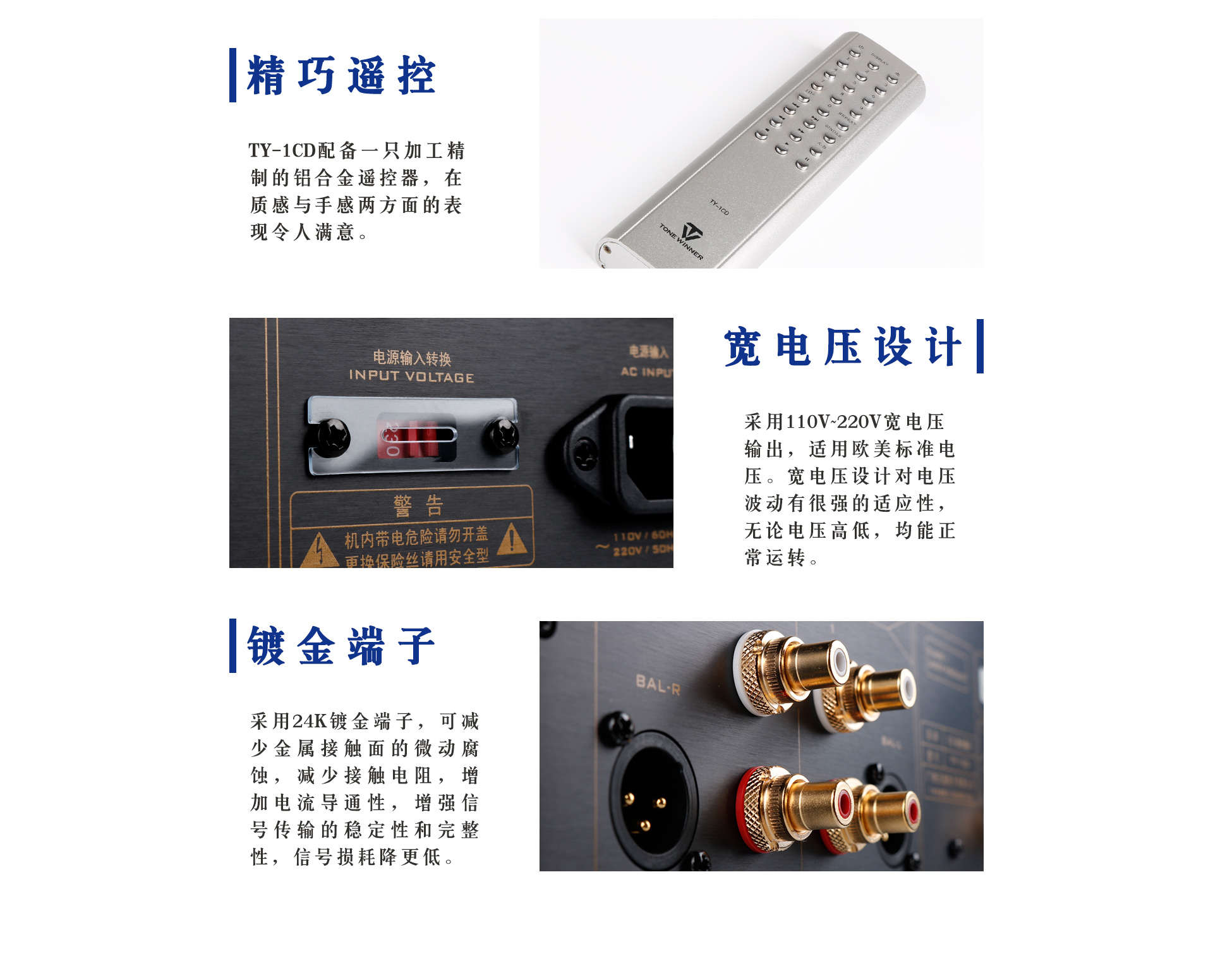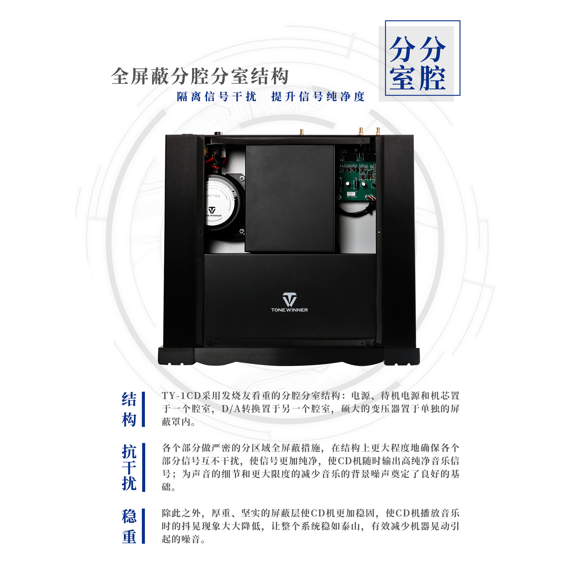 二、用料及電路設計 TY-1CD的輸出接口均采用24K鍍金端子,能減少金屬接觸面的微動腐蝕,進而減少接觸電阻,增加電流導通性,同時能有效增強信號傳輸的穩定性和完整性,降低信號傳輸中產生的衰減值,避免高衰減值給高低頻信號帶來的不穩定,將信號損耗降到最低。 令人遐想的解碼內“芯”:采用美國ESS公司的旗艦芯片ES9028,這顆芯片被譽為“業界最頂級的數字音頻解碼芯片”,其信噪比高達129dB,總失真低于-120dB,最高支持32bit/384kHz高規格輸入信號,支持多種高清音頻格式解碼,性能驚人!除此之外,ES9028可以直接通過同軸和光纖傳輸和播放3.078mhz的DOP(DSD,SACD),這是其他解碼芯片所不能及的。ES9028芯片能保證超強解析力,聲音音場比較開闊,真實的現場感和自然的泛音,余音繞梁,音樂味道濃,質感很好,低頻表現力強。 性能卓越的運算放大器:I/V轉換電路運放采用了TI公司頂級全差分運放OPA1632,能減少偶次諧波,減少共模噪聲干擾,最大限度保證了平衡傳輸信號的高保真性能指標;而平衡轉非平衡電路運放則采用TI公司頂級雙極型運放OPA1612,這是一款高性能、雙通道、雙極輸入音頻運算放大器,失真度低至0.000015%,噪聲密度低至1.1nV/√Hz! 精選高端定制電容:濾波電容采用ELNA大容量高品質電容,信號耦合電容采用ELNA音頻專用電容,為松軟富有彈性的低頻、純厚溫暖的中頻、細膩通透的高頻提供強力保證。 高端定制機芯:作為CD機不可或缺的一部分,設計師在二十多次反復試驗下,最終選定這款天逸定制的機芯。該機芯整體結構牢固可靠精密,讀碟準確性高,且外加金屬防震基座,有很好的防震緩沖效果,同時有效抑制對自身和外來震動使光頭讀碟系統減少抖晃,減少誤碼的產生,提高讀碟準確率。