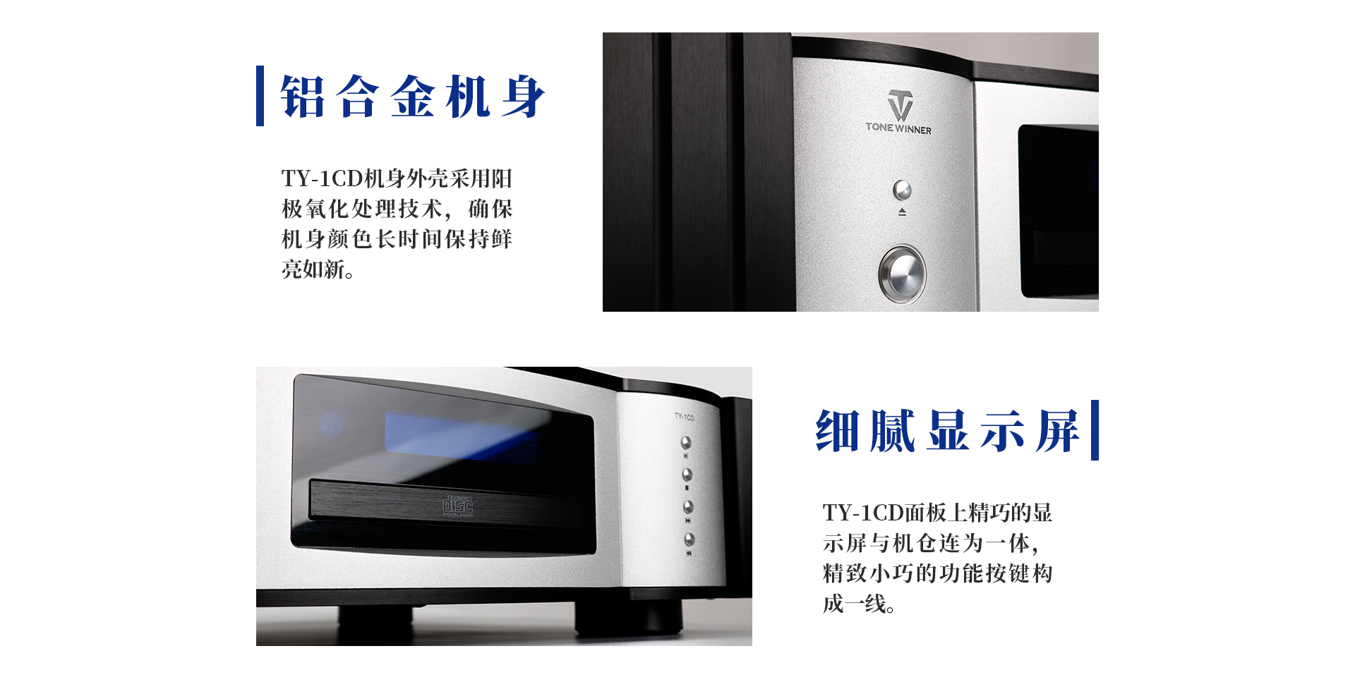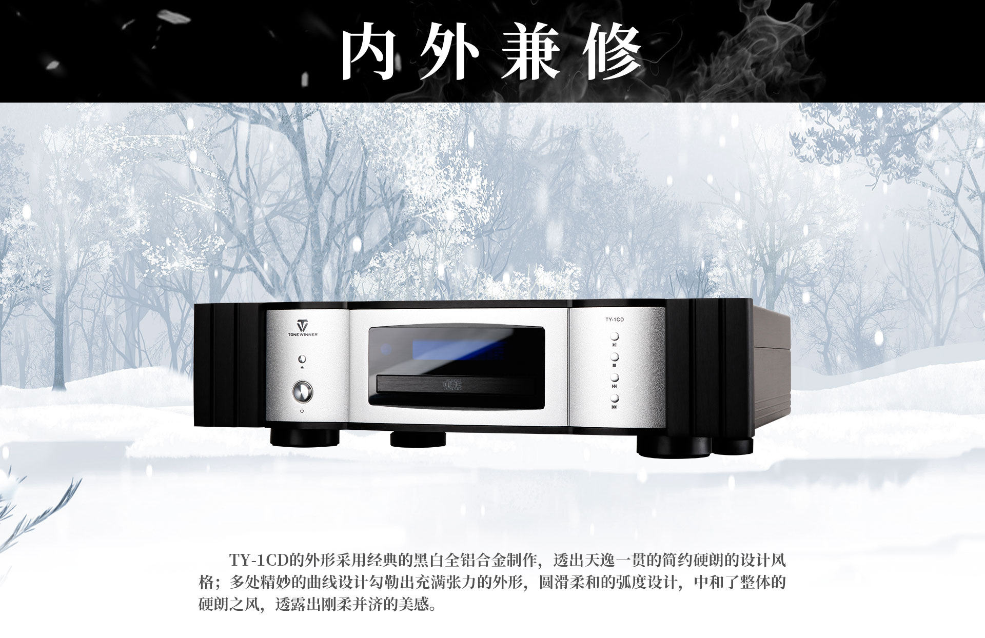 一、外觀特點 TY-1CD的外形與以往天逸HI-FI旗艦級產品風格一脈相承,采用經典的黑白全鋁合金制作,表現了天逸一貫的簡約大氣的設計風格;多處精妙的曲線設計,勾勒出充滿張力的外形;棱角分明的設計在優雅中透露出一種硬朗的英氣。 機身外殼采用陽極氧化處理技術,確保機身顏色長時間保持鮮亮如新。精細的LCD點陣屏與機倉連為一體,精致小巧的功能按鍵連成一線,再配上一只加工精制的鋁合金遙控器,在質感與手感兩方面的表現令人滿意,這些細節無一不給人以奢華典雅的視覺沖擊感,處處洋溢著旗艦級產品的典范。