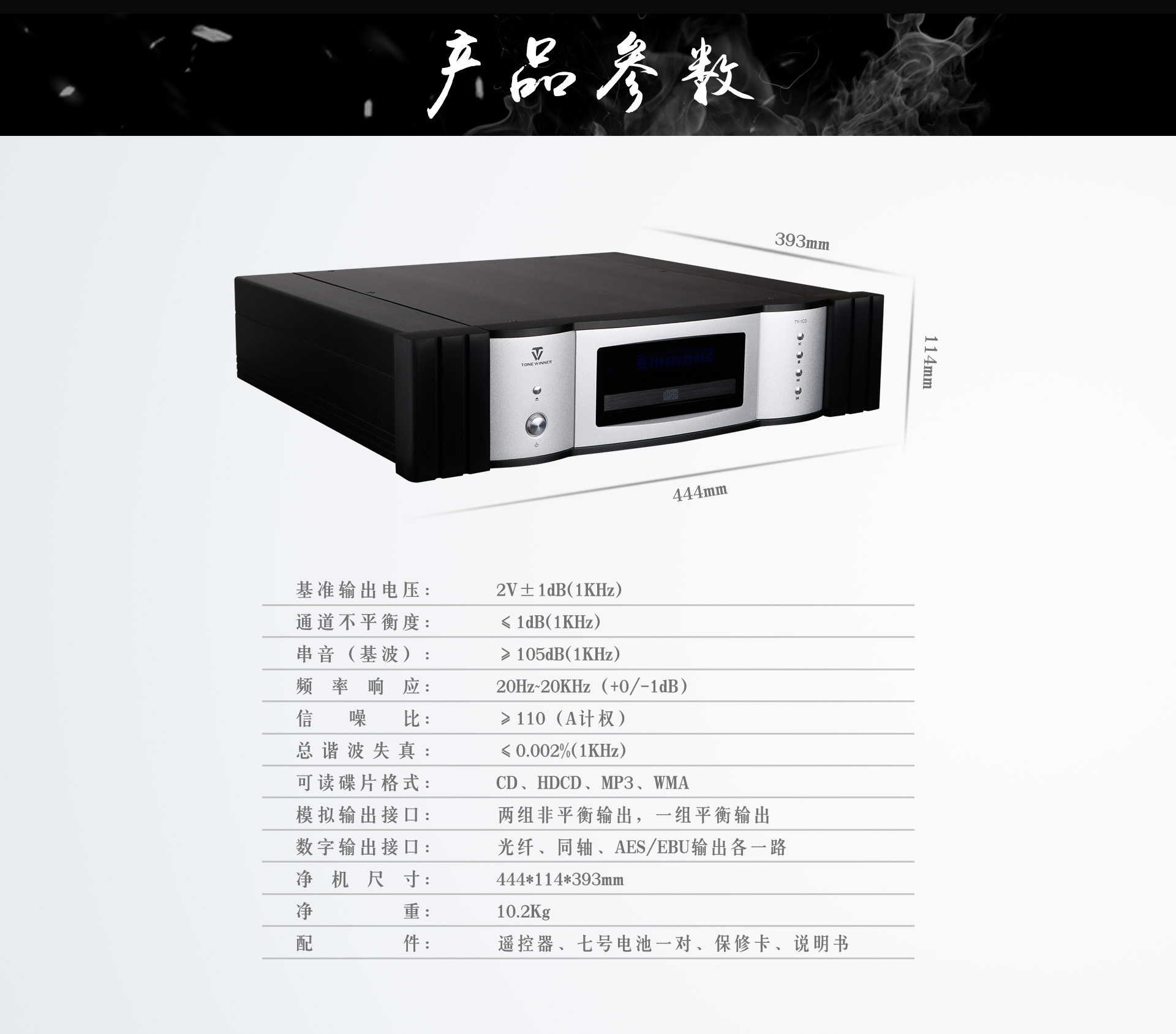 五、產品性能參數 信噪比:≥108(A計權) 總諧波失真加噪聲:≤0.005%(1kHz) 頻率范圍:20Hz~20kHz(+0/-1dB) 基準輸出電平:2V±1dB(1kHz) 支持音樂格式:CD、HDCD、SACD(CD層)、MP3、WMA 通道不平衡度:≤1dB 串音(基波):≥105dB(1kHz) 產品材質:鋁合金 外觀顏色:銀色 凈重:10.2kg 毛重:13kg 整機尺寸:444×114×393mm(寬×高×深) 包裝尺寸:597*532*180mm(長寬高) 推薦搭配:AD-1PRE+AD-1PA 隨機附件:遙控器、電池一對、保修卡、說明書 適用場合:聽音室、會所、演示廳、宴會廳、演繹廳等大環境高品質音樂的場地