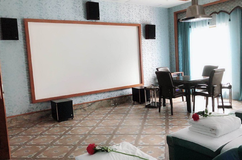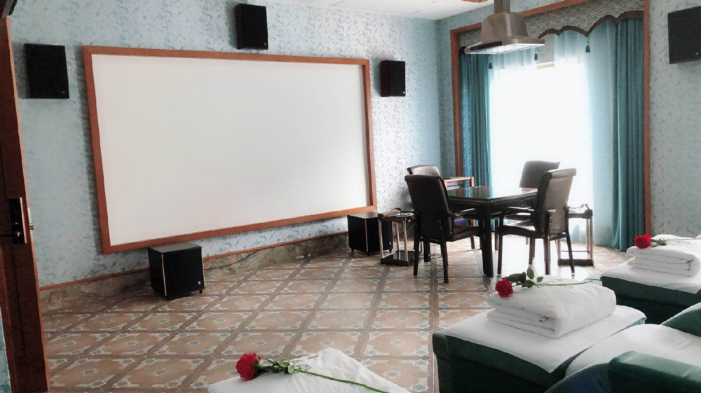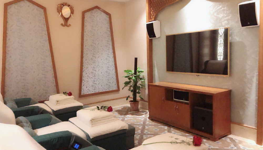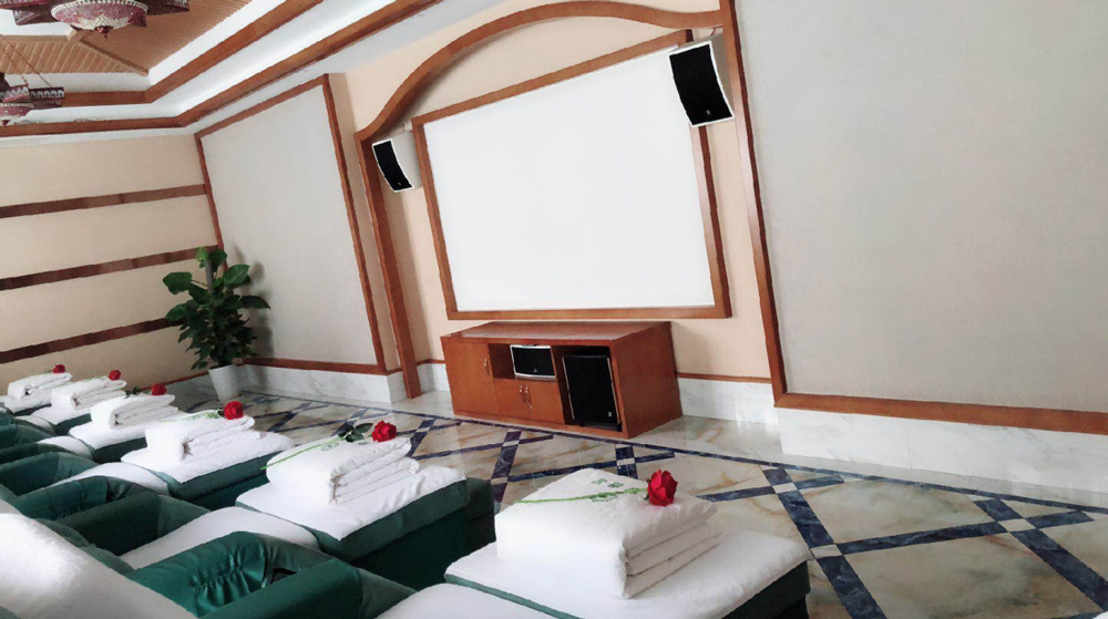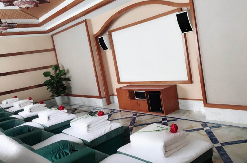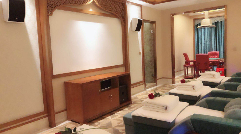 設計者心得: 根據甲方要求,整個洗浴城以商務洽談、朋友聚會、約會等休閑為主,在設計過程中我們充分考慮結合周邊消費群體的特質,以此作為裝修風格的基礎。在音視頻設備配置方案上,因甲方要求較高,經過嚴謹設計,我們最終采用愛譜生投影機,定制高清幕布;在音響選擇上,我們花了更大的心思,在反復對比中選用了天逸的微影院系列、影K系列、全景聲系列,天逸的功放設備在唱歌、聽音樂、看電影等方面提供一體化解決方案,觀影的時候低頻動下潛有力,中高頻細節絲毫畢現,唱歌人聲甜美動聽,而音樂也能做到細膩通透,舒適悅耳,特別是經過天逸獨有的全自動聲學掃描自動房間EQ調整,將觀影時的現場聲像定位發揮的淋漓盡致,也給整個視聽效果提升一個檔次,所以通過皇家匯皇家貴足足浴城良好的服務,專業的技術,獲得廣大客戶的一致好評,口碑效應明顯。在南昌南昌蓮西大道的分店影院足療包廂項目引起全城轟動。