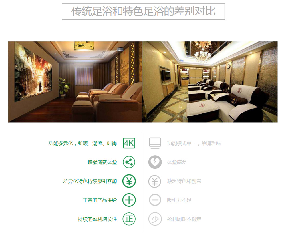 足浴作為一個傳統服務行業,目前已基本處于飽和狀態,行業經過多年的高速發展,逐漸開始步入緩慢甚至遲滯的發展階段。當前消費升級的大背景下,傳統足浴店亟待轉型升級,如何尋找保證服務質量與成本節約之間的平衡,打造出具有差異化和個性化的主題和服務是傳統足浴店當務之急的課題——影院式足浴無疑是一個很好的選擇。 影院式足浴的關鍵在于:私密、娛樂、放松、任性。每一點都是站在客戶體驗的角度,對消費者的消費需求做出了新的詮釋,在一個封閉的私密環境下,就像在電影院里一樣擺了幾張床,任性的躺著,看著想看的大片,還有專業技師來緩解疲勞,想想都是一件很愜意的事情。影院式足浴,又將是娛樂行業一個新的消費增長點。