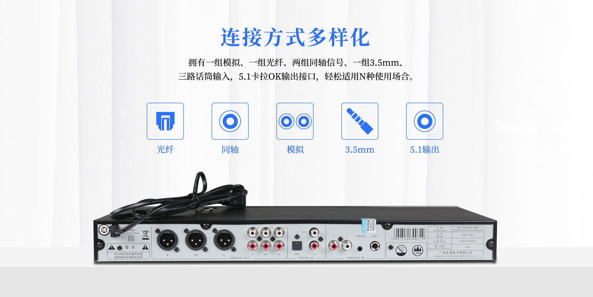 4.兩組同軸、一組模擬、一組光纖、一組3.5mm、三路話筒輸入,適應(yīng)各種K歌場(chǎng)合;