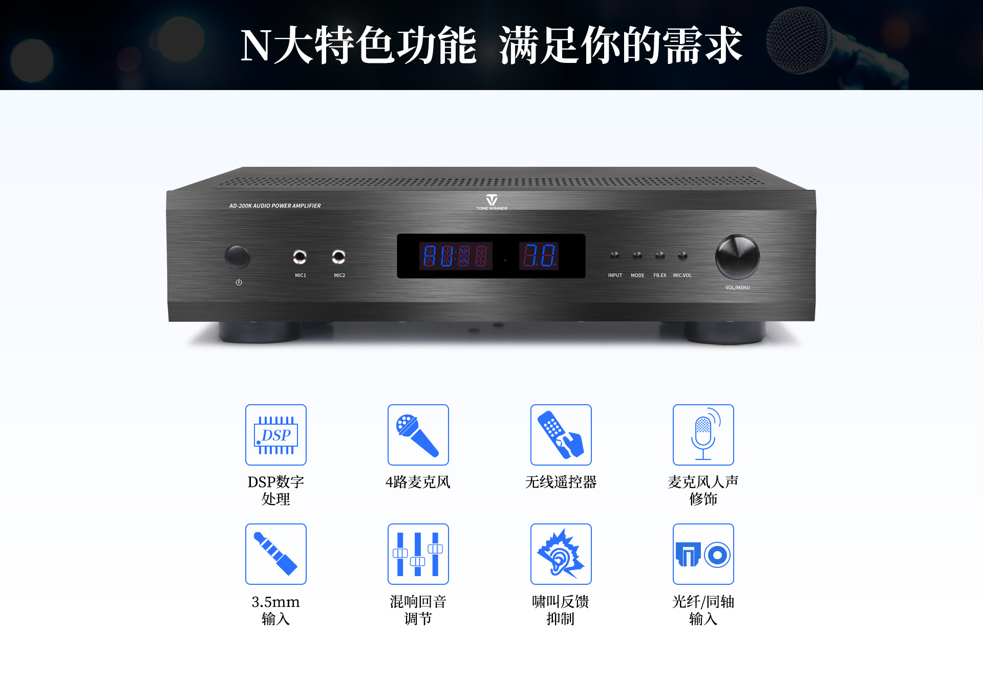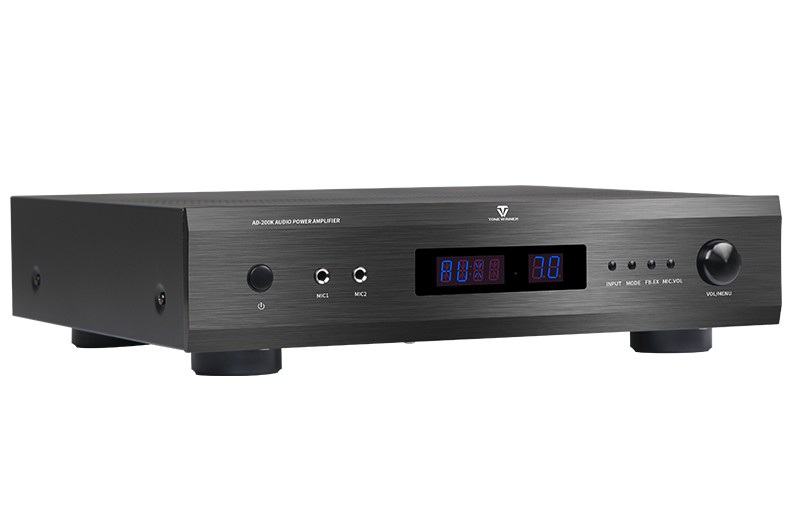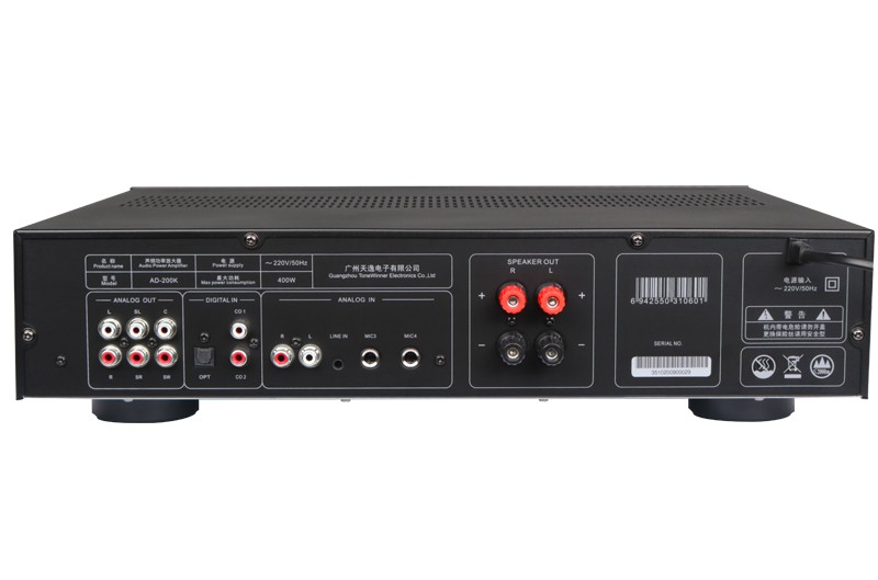 一、功能介紹 1、專業DSP音效處理,內置10種話筒效果。 2、120W*2輸出功率,輕松驅動音箱。 3、九級防嘯叫,無懼噪聲干擾。 4、獨立話筒人聲高中低音調節。 5、支持3.5mm、模擬、同軸、光纖等輸入接口。 6、支持四路話筒同時輸入。 7、5.1聲道信號輸出,靈活搭配純后級功放。 8、多功能紅外遙控器。