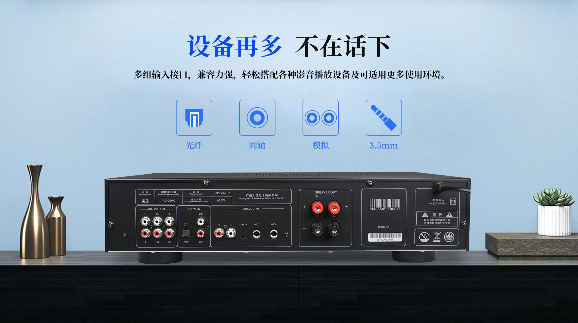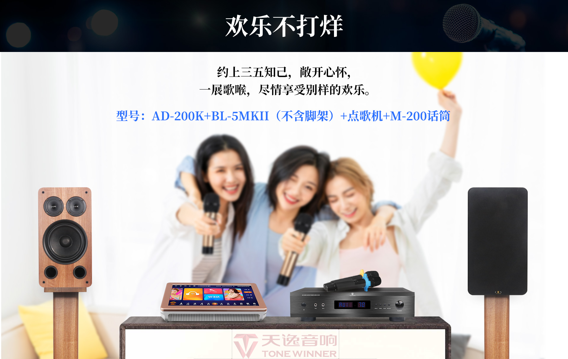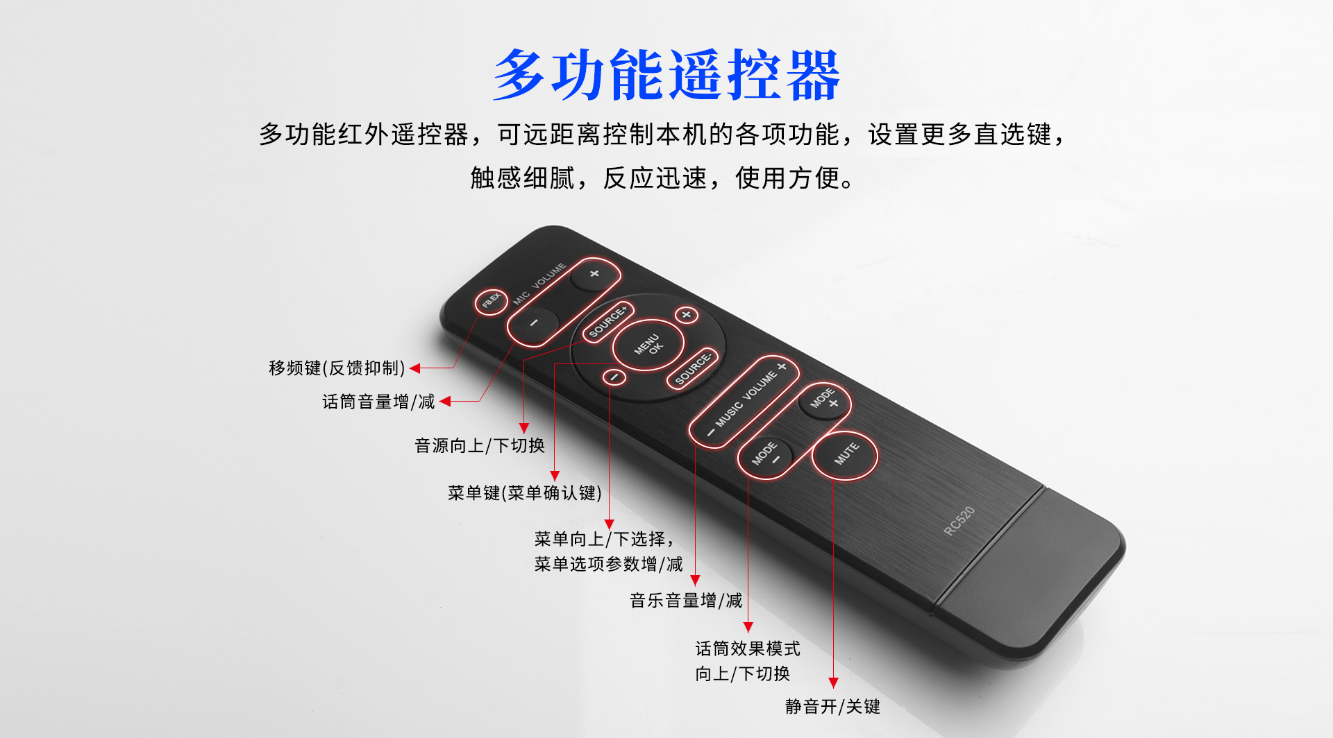 | 適用場所:KTV、多媒體會議室、娛樂活動中心、接待室等擴聲 | 隨機配件:說明書、遙控器、7號電池、自帶電源線、影音線、合格證 |