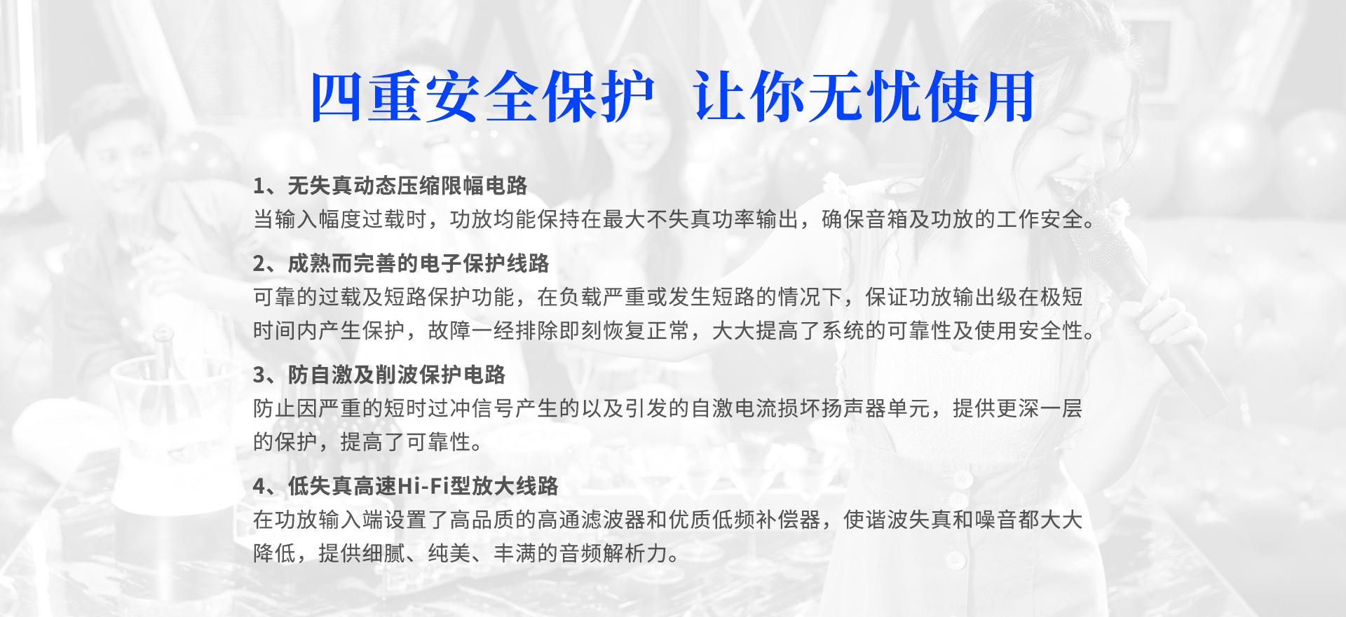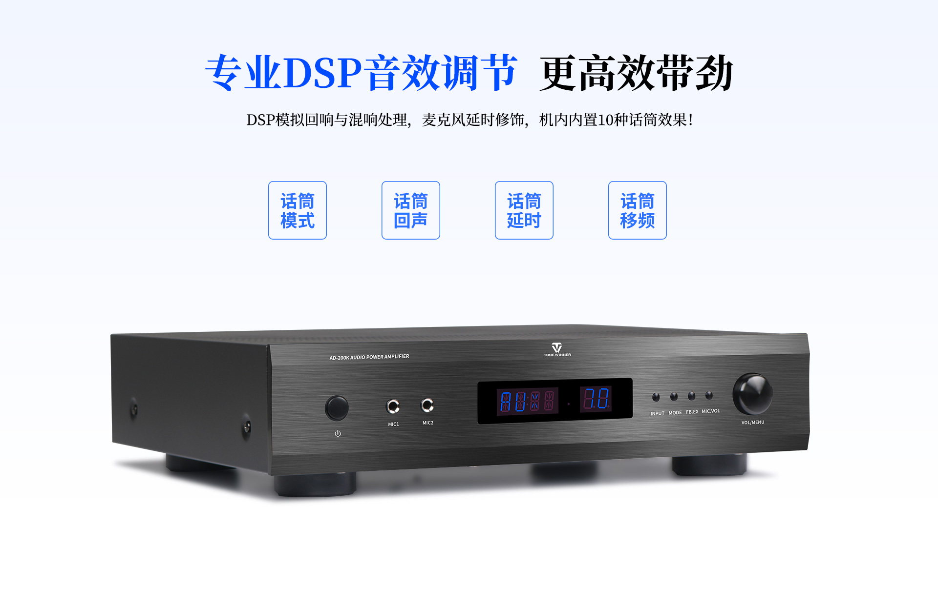 | 諧波失真:音樂:≤0.05%(1KHz);話筒:≤0.1%(1KHz) | 頻率響應:音樂:20Hz-20KHz(+1/-3dB);話筒:20Hz-15KHz(+1/-3dB) |