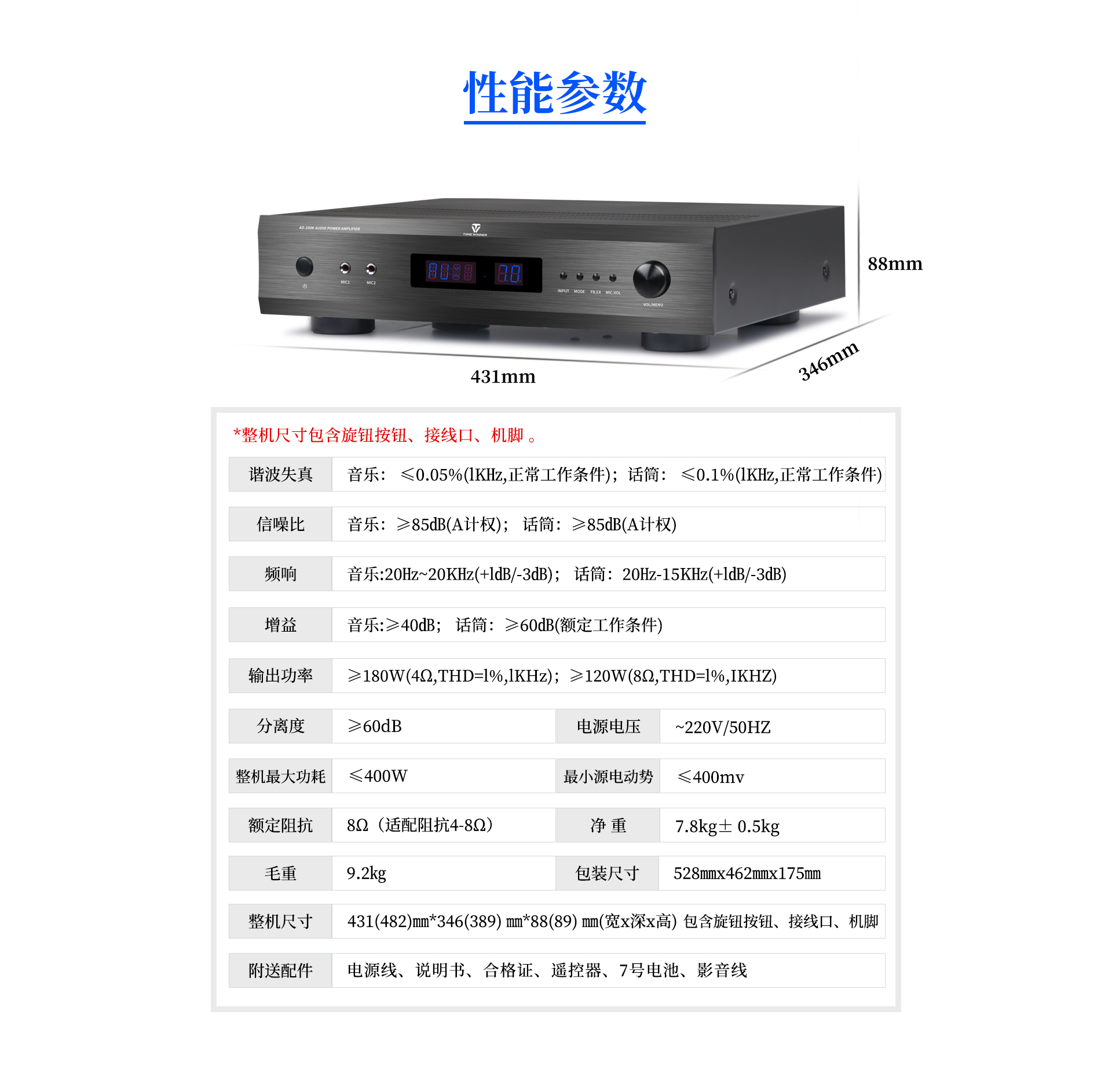 二、產品性能參數 1、諧波失真:音樂:≤0.05%(1KHz, 正常工作條件);話簡:≤0.1%(1KHz,正常工作條件) 2、信噪比:音樂:≥85dB(A計權);話筒:≥85dB(A計權) 3、頻響:音樂:20Hz-20KHz(+ldB/ -3dB);話簡: 20Hz-15KHz(+ ldB/- 3dB) 4、增益:音樂:≥40dB;話簡: ≥60dB(額定工作條件) 5、輸出功率:≥180W(4Ω,THD=I%,1KHz);≥120W(8Ω,THD=l%,IKHZ) 6、分離度:≥60dB 7、額定阻抗:8Ω(適配阻抗4-8Ω) 8、電源電壓:-220V/50HZ 9、整機最大功耗:≤400W 10、最小源電動勢:≤400mv 11、凈重:7.8kg士0.5kg 12、毛重:9.2KG 13. 隨機配件:說明書、遙控器、7號電池、自帶電源線、影音線、合格證 |