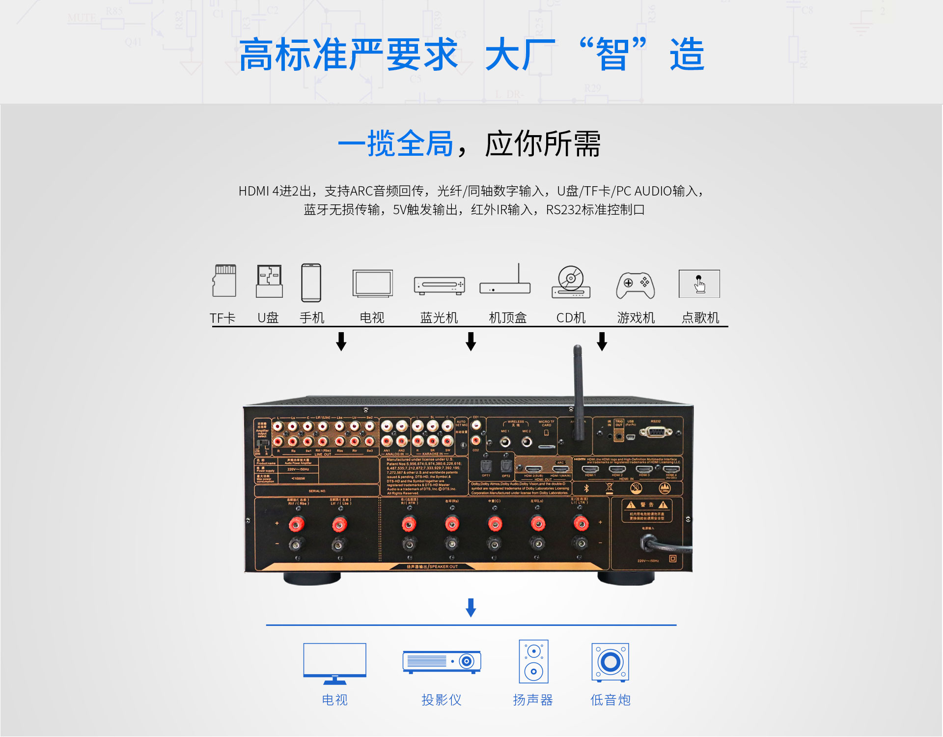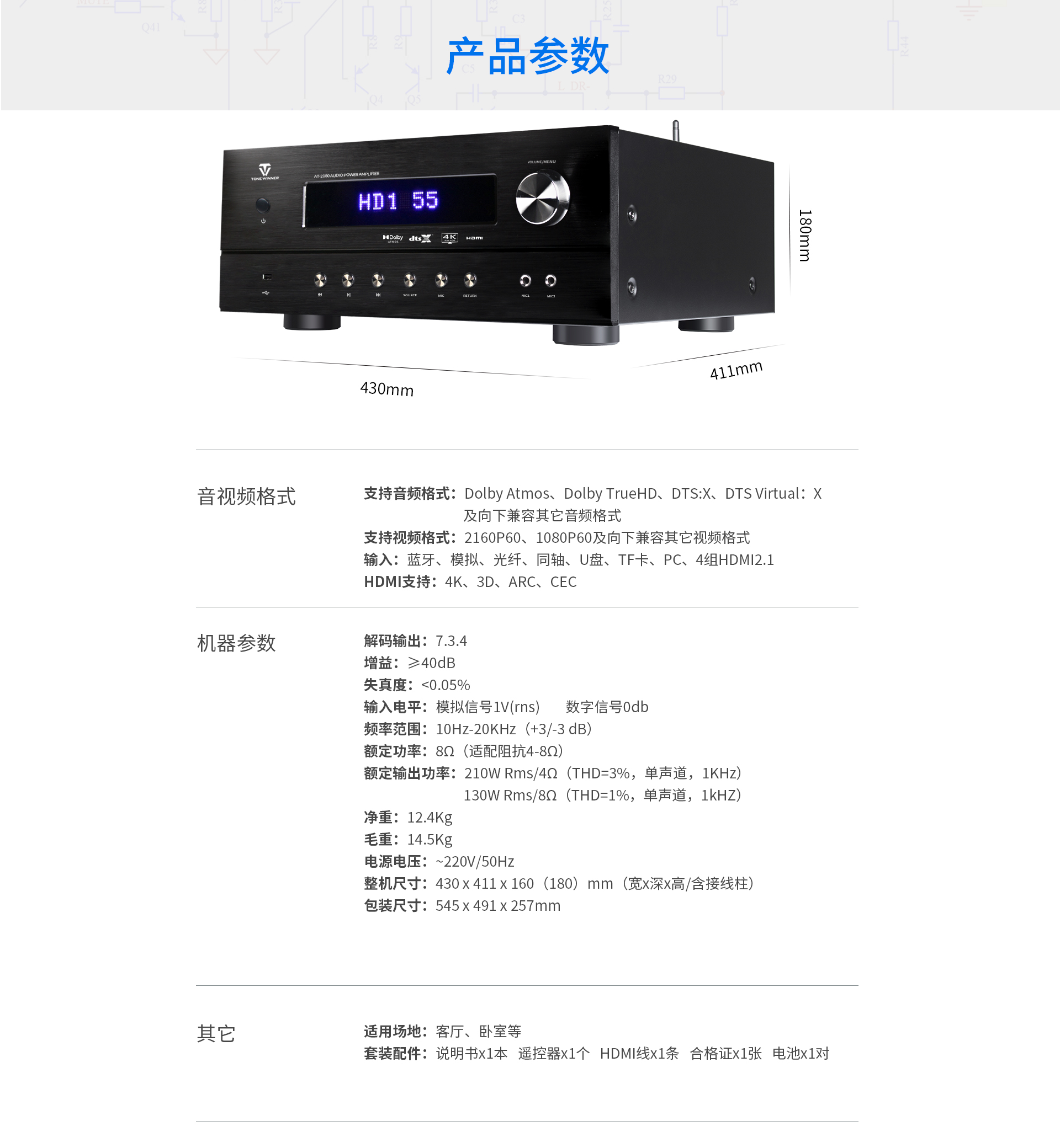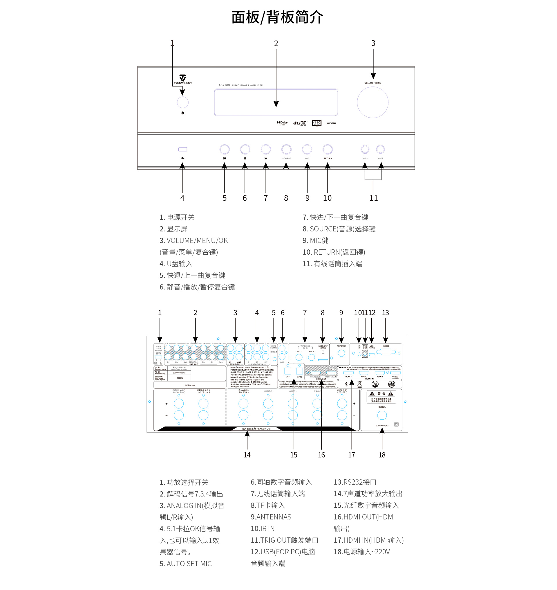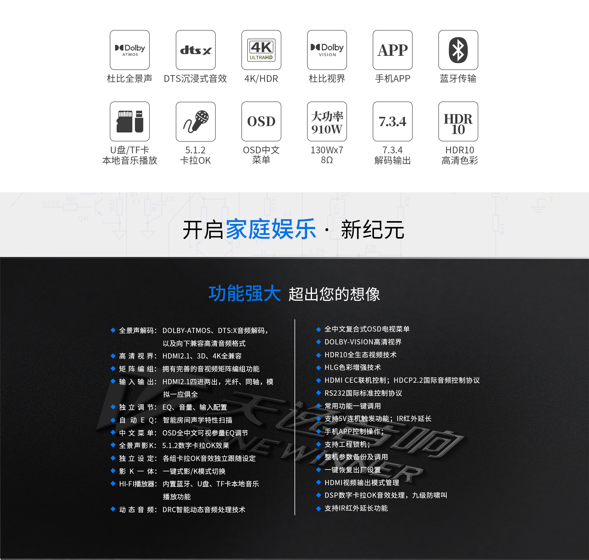 三、功能特點 1.支持Dolby Atmos、DolbyTrue-HD等所有杜比無損及有損壓縮音頻編碼文件;支持DTS:X、DTS-Master等所有DTS無損及有損壓縮音頻編碼文件。 2.支持4K/60Hz,RGB 4:4:4,18GHz全帶寬視頻信號,支持Dolby Vision及HDR 10視頻信號。 3.支持HDMI2.0,支持HDCP2.2。 4.多達14聲道的全景聲7.3.4音頻解碼線路輸出。 5.內(nèi)置全景聲卡拉OK系統(tǒng),強大的DSP數(shù)字混響效果及九級防嘯叫移頻處理技術(shù),多種人聲風(fēng)格選擇。 6.房間EQ、揚聲器距離、延時、聲壓的自動測試及補償,一鍵式操作,全自動校正,同時支持用戶手動調(diào)節(jié)。 7.內(nèi)置藍牙數(shù)字音頻接收器。 8.內(nèi)置高品質(zhì)音樂播放器播放器,支持TF卡及U盤音頻文件播放,支持FLAC、APE、WAV、MP3等多種無損及有損壓縮音頻格式,支持多層文件夾管理。 9.支持手機APP操作。 10.支持全中文疊加式OSD屏幕顯示菜單。 11.支持本地音樂信息手機及電視可同步讀取顯示。 12.支持從2.0聲道到7.3.4聲道等8種揚聲器配置。 13.支持HDMI 4進2出,2組同軸2組光纖數(shù)碼音頻輸入,3組模擬音頻輸入。 14.支持5.1聲道外部混音輸入,可外掛混響器。 15.支持RS232集中控制器。 16.支持HDMI ARC音頻回傳,支持CEC控制。 17.支持高達1000ms時長的唇音同步調(diào)節(jié)。 18.每聲道多達5~11段參數(shù)EQ。 19.支持音視頻混搭編組。 20.支持按輸入源獨立設(shè)置及保存參數(shù)的功能。輸入源獨立EQ選擇,獨立卡拉OK控制。 21.支持話筒音量及音樂音量的開機設(shè)置和最大音量限制。 22.多種常用功能一鍵調(diào)用。 23.內(nèi)置全球五大測試系統(tǒng)之一——ETQ房間聲學(xué)自動測試校正軟件。 24.支持USB-AUDIO數(shù)字信號輸入功能。 25.支持IR紅外延長功能(需額外購買紅外延長器,延長器無需獨立供電)。 26.支持5V連機觸發(fā)功能。 27.支持工程鎖機。 28.支持整機參數(shù)備份及調(diào)用。 29.支持一鍵恢復(fù)出廠設(shè)置。 30.支持用戶參數(shù)保存及調(diào)用設(shè)置。