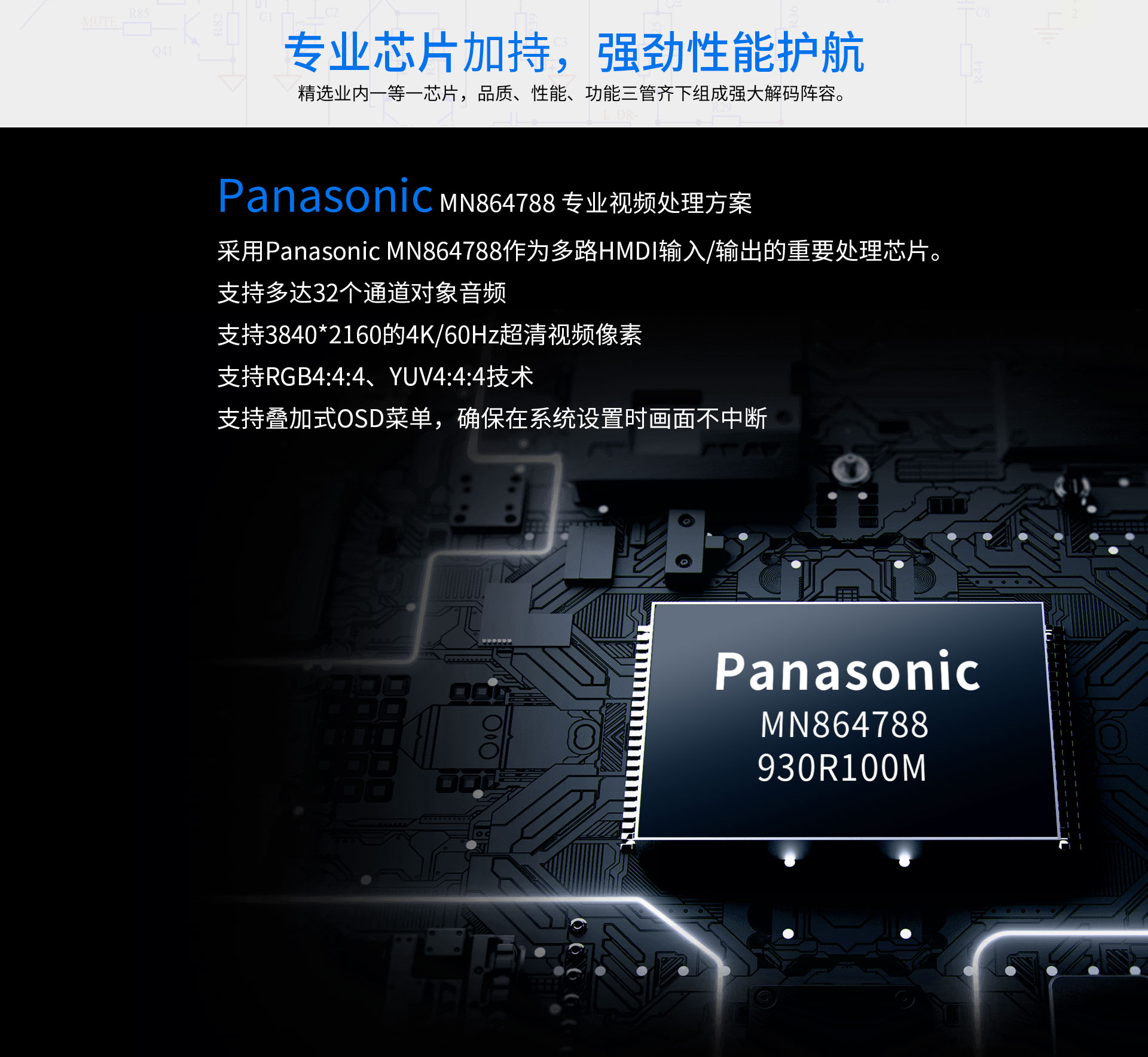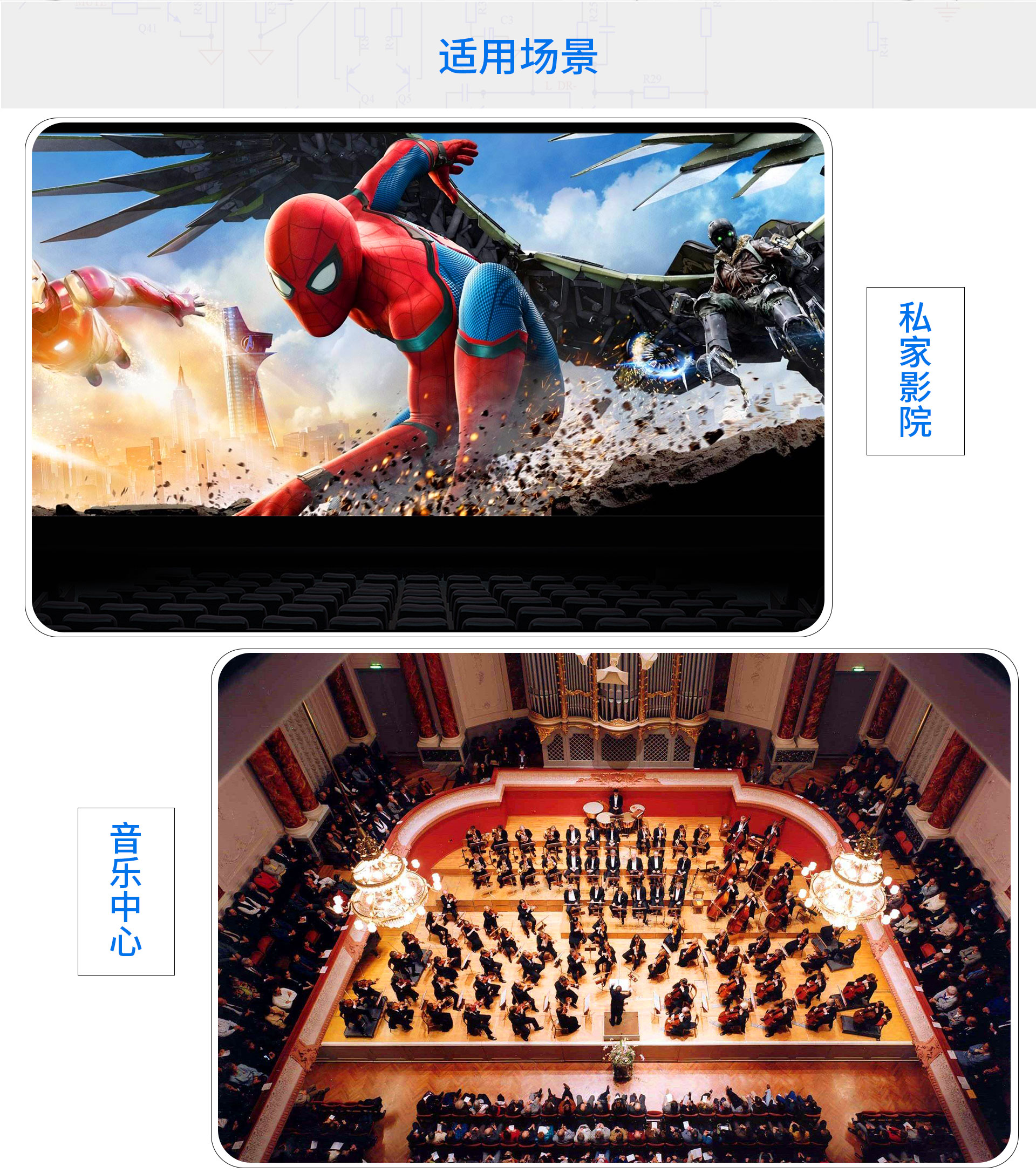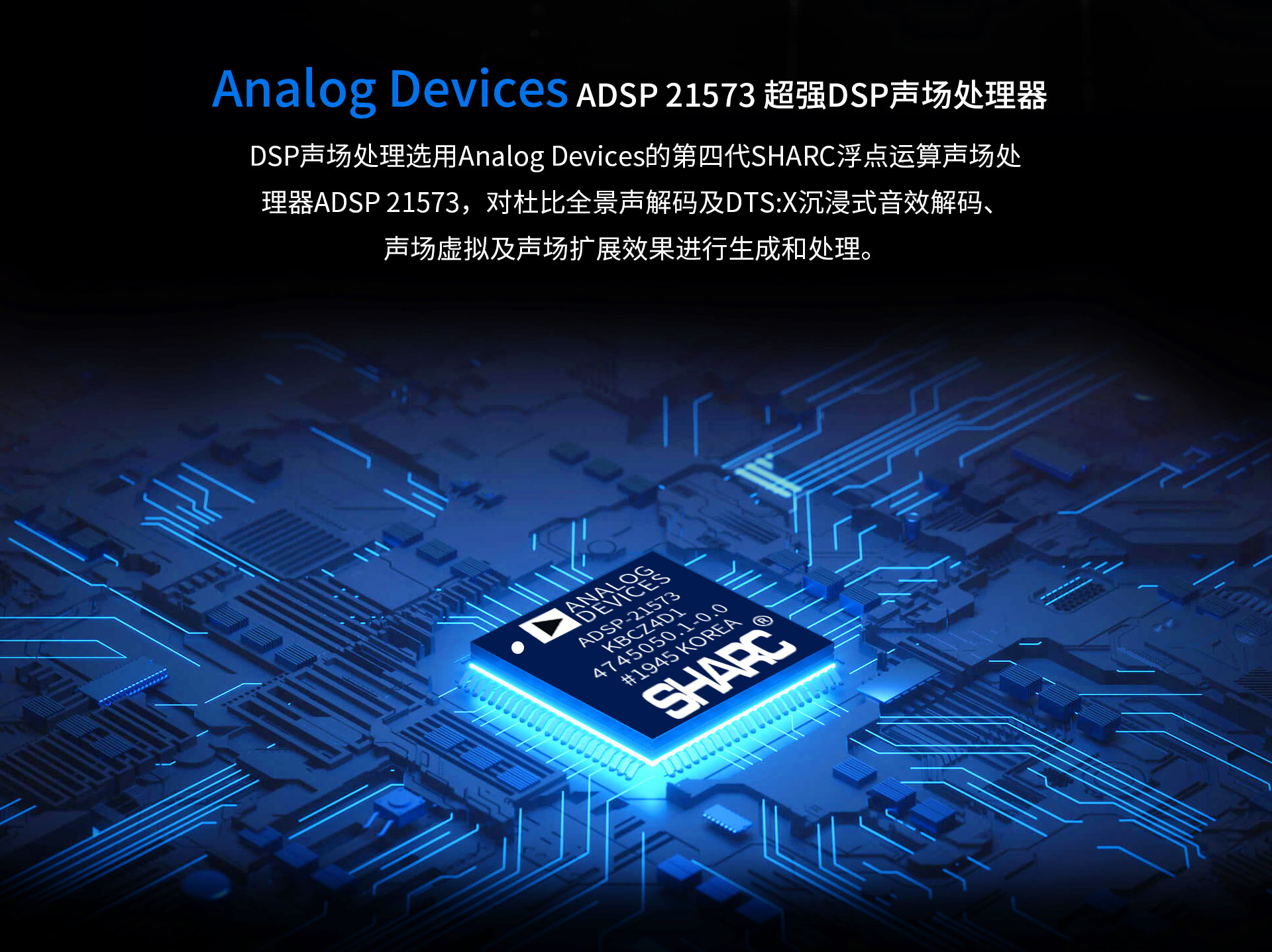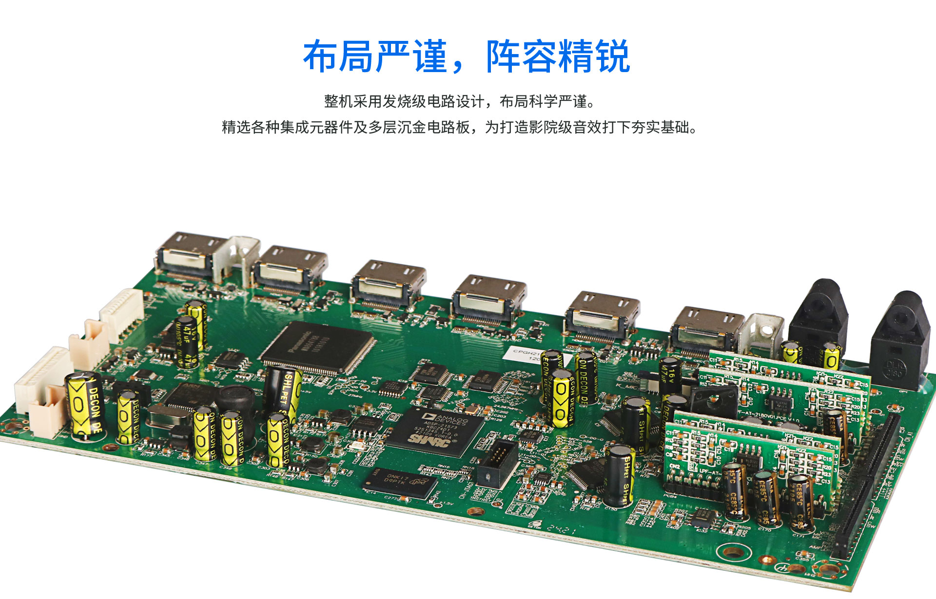 二、用料及電路設(shè)計 1.內(nèi)置7×180W大功率H類HiFi功放,可直接驅(qū)動5.1.2聲道配置的揚聲器。 2.內(nèi)置450W巨型環(huán)牛為功放動力之源,能量充沛。 3.采用日本松下MN864788作為多路HDMI輸入/輸出的重要處理芯片,Analog Devices公司的第四代SHARC浮點運算聲場處理器ADSP-21573完成DSP聲場處理,搭載兩顆經(jīng)典的多功能綜合音頻處理器CS42528,全面應(yīng)對Dolby Atmos和DTS:X的解碼,以及負責(zé)進行DSP聲場后處理,包括聲場虛擬及聲場擴展,并進行音效的調(diào)整和諸多喇叭的頻響曲線調(diào)整和音色校正。 4.整機采用發(fā)燒級電路設(shè)計,精選集成元器件及多層沉金電路板,為影院級音效打下夯實基礎(chǔ)。
